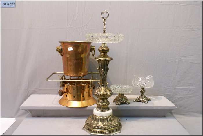 A copper burner and grill, a copper ice bucket, plus a cast and glass ashtray etc.