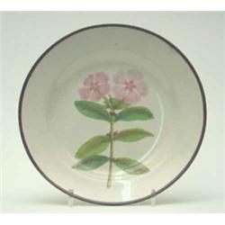 A creamware botanical dessert plate, possibly Swansea, finely painted with a Perriwinkle, named verso in red enamel, formerly attributed to Thomas Pardoe, chocolate-brown rim, impressed numeral, circa 1800, 8ins and 8.5ins £250-300