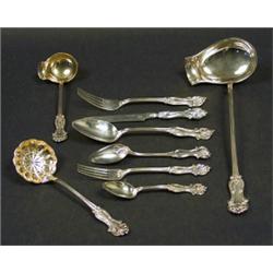 silver, contains: 12 forks, 14 soup spoons, 12 entree forks, 11 entree knives, 12 teaspoons, sprinkler spoon, gravy spoon and soup ladle