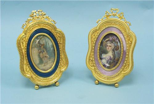 A decorative pair of miniature French bronze easel picture frames. Of oval form, with serpentine sides, top mounted with ribbon ties. Oval shape with enameled borders. 6 3/4" high.