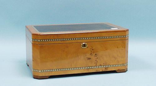 A decorative walnut humidor with dark cherry wood inlaid top. The rectangular box with canted corners, decorated with geometrical inlays in brown and white. Interior with built hygrometer. 15" x 10", 7" high.