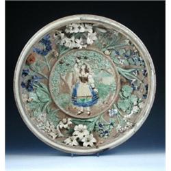 A deep dish moulded centrally with a lady picking grapes in a landscape, the surrounding cavetto re.