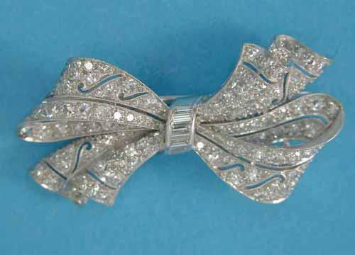 A diamond bow brooch, of piercework design set brilliant and baguette cut diamonds, 1.75ins £400-600