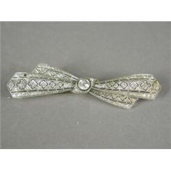 A diamond pierced bow brooch set with a single old cut stone of approx 0.50ct and encrusted with approx 2cts of single cut stones (one missing), set in white metal (tests platinum), 7cm long Est. 600/800