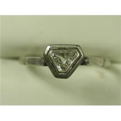 A diamond solitaire ring set with a triangular stone in white metal (tests platinum), size M