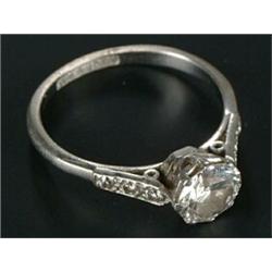 A diamond solitaire ring, the round brilliant approx. 0.97cts, claw set between small three stone shoulders, stamped '18ct & plat'