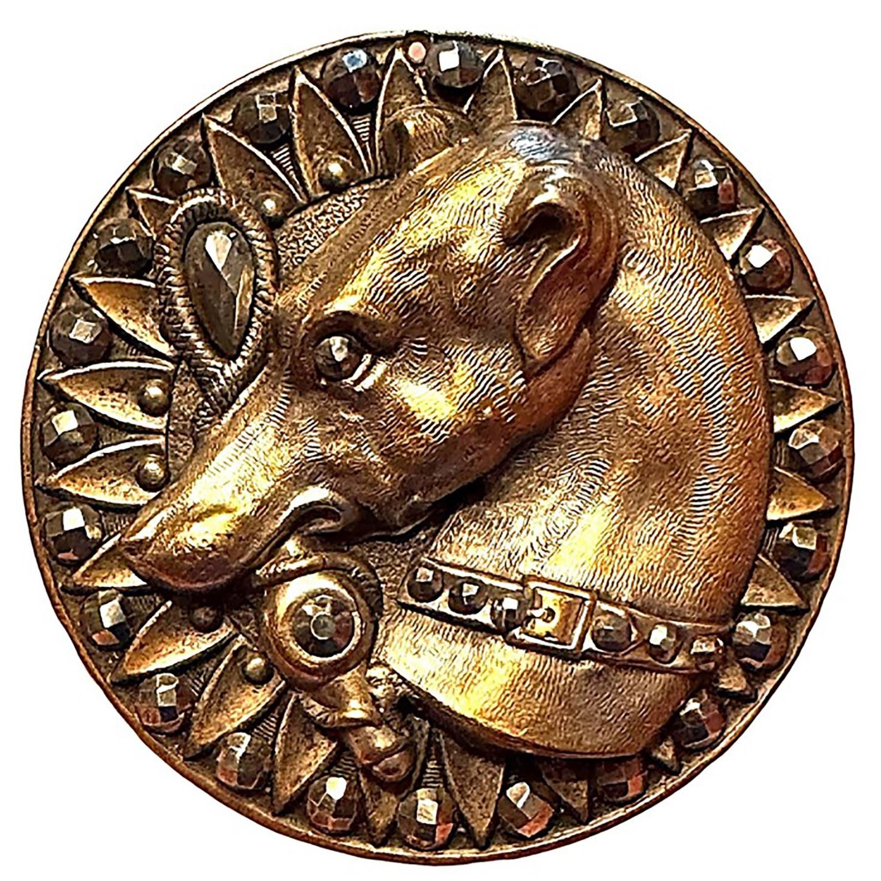 1 Extra large 19th century high relief steel OME Whippet button. Here is a fantastic and detailed button of the Whippet dog embellished with different shaped cut steels and framed with an ornate border. Great button from the collection of Jose Roman.