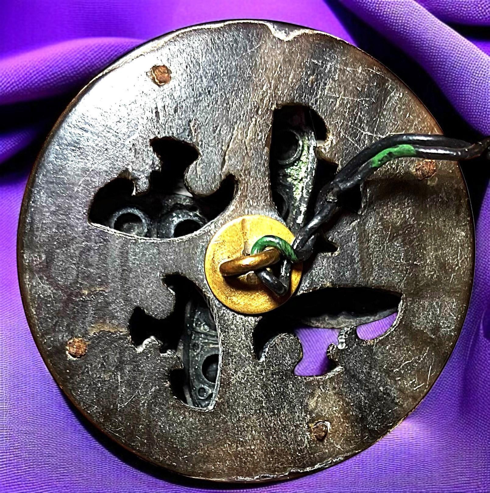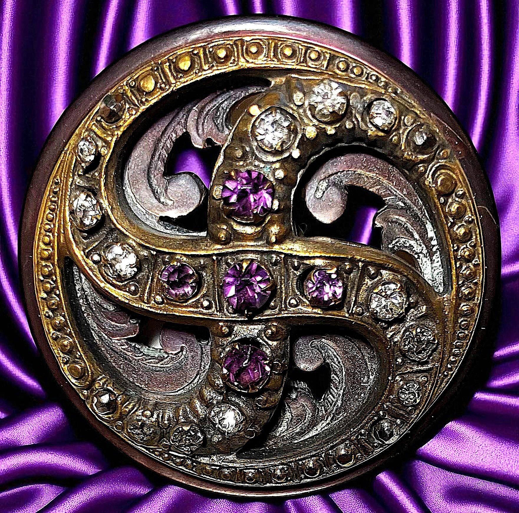 1 Large 19th C. pierced example with brass and colored pastes. Here is an exquisite pearl button with beautiful carving and piercing. The base of the pearl has a purple tone to the pearl and is set with a brass design on top and accented with clear and purple paste jewels. A striking and wonderful example.