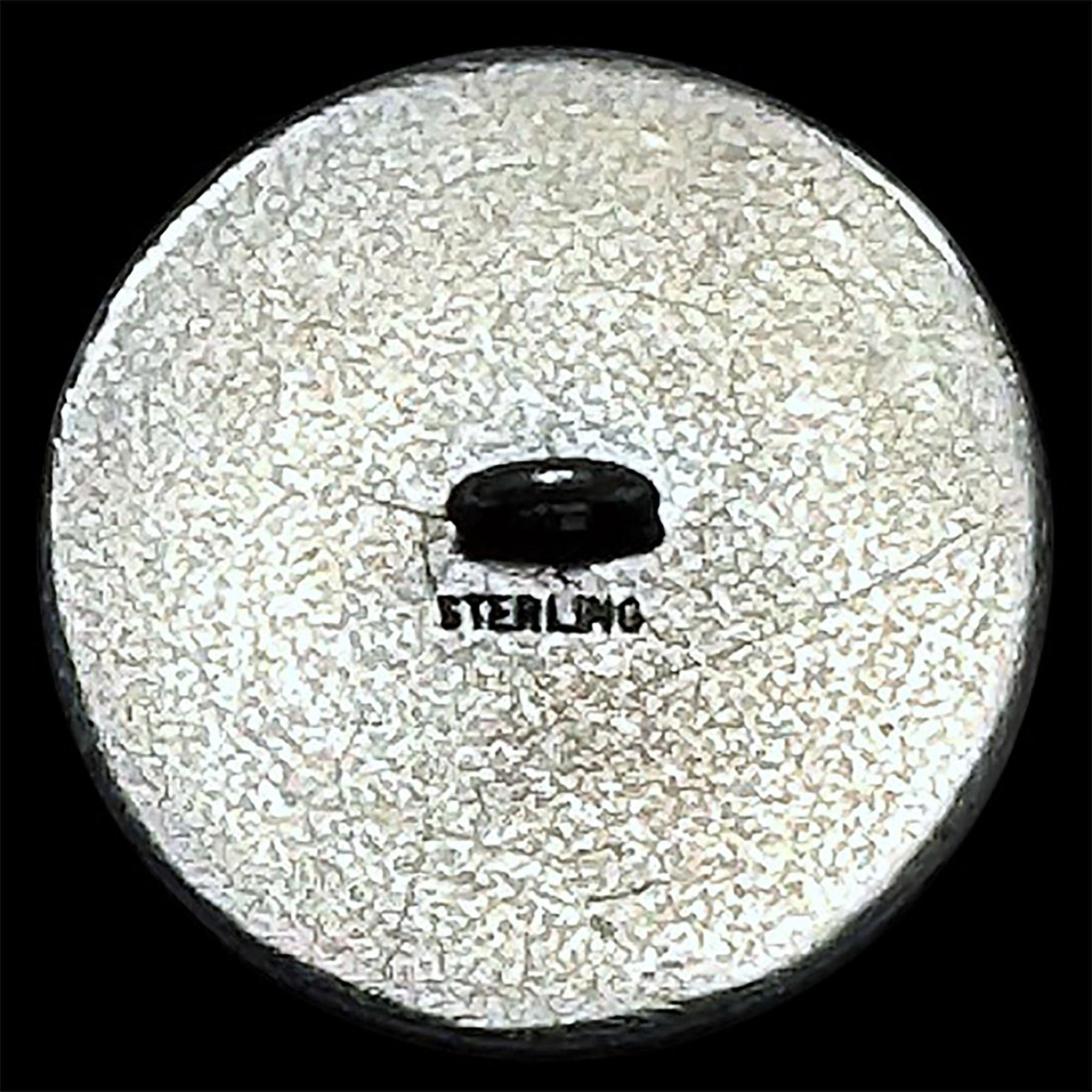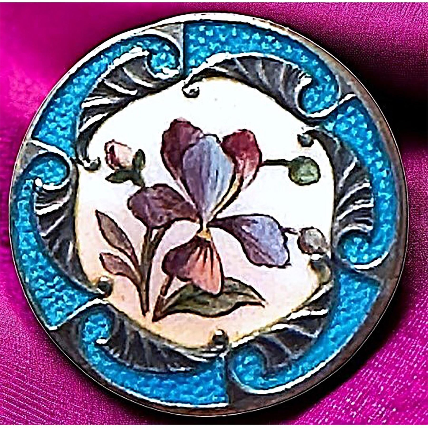 1 medium size 19th century Guilloche & Emaux Peints enamel. Here is a striking and stunning example of enamel work during the Art Nouveau era. The central design of the Iris flower was executed in the Emaux Peints technique (hand painted) and bordered by multiple Ginkgo Leaves in raised silver and then further framed in the Guilloche (engine turned) technique. The button is backmarked Sterling and is in fine condition. A great addition to your collection. You can learn more about these enamel terms in a new book titled Enamel Buttons by Karen Cohen.