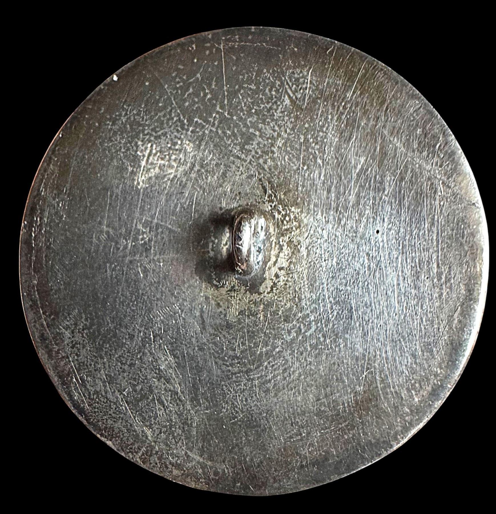 1 Large early 20th century hallmarked silver and enamel example. Here is a beautifully detailed example of a pictorial silver button with two colors of enamel typical to the Arts and Crafts designs of the late 19th and early 20th century. Although not a Liberty & Co. example the colors suggest the likeness of the enamels used on Liberty and Cymric pieces. The design of the tree and landscape is quite unusual and in fine condition. The hallmark below on the front represents the maker initials of KK. A wonderful and beautiful example.