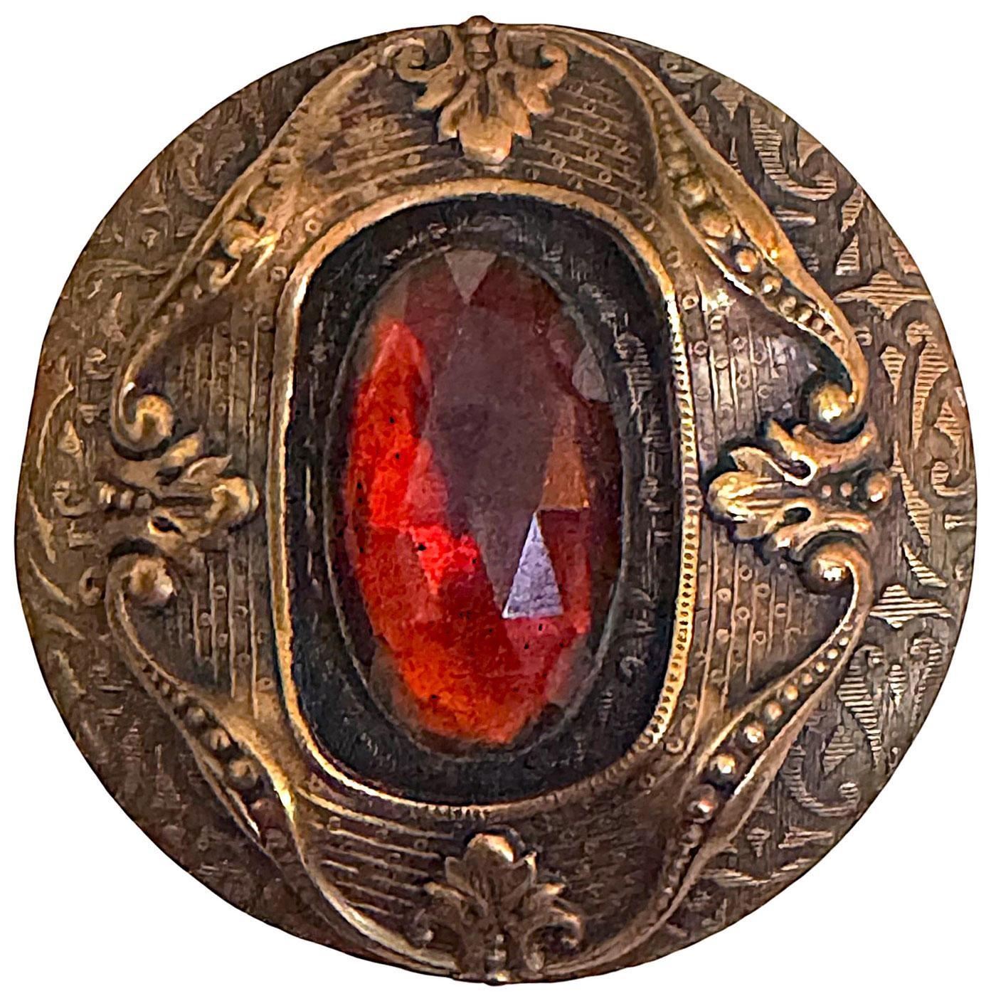 1 Large late 19th century Red glass in metal example. Here is a wonderful ornate Gay 90 button from the Victorian Era. Red glass jewels are one of the hardest colors to come by and this oval glass jewel is quite beautiful and vibrant. A wonderful example of a Gay 90 button.