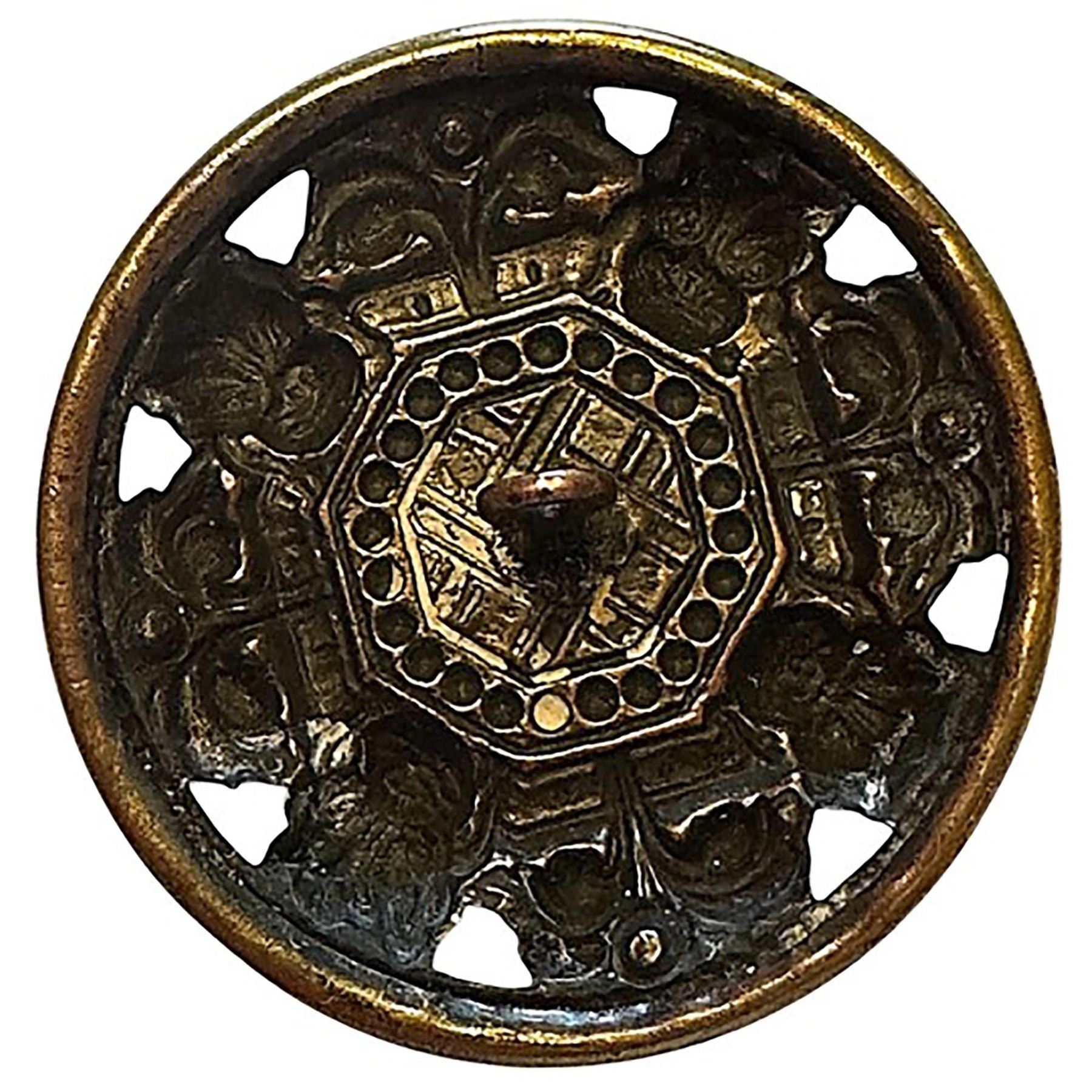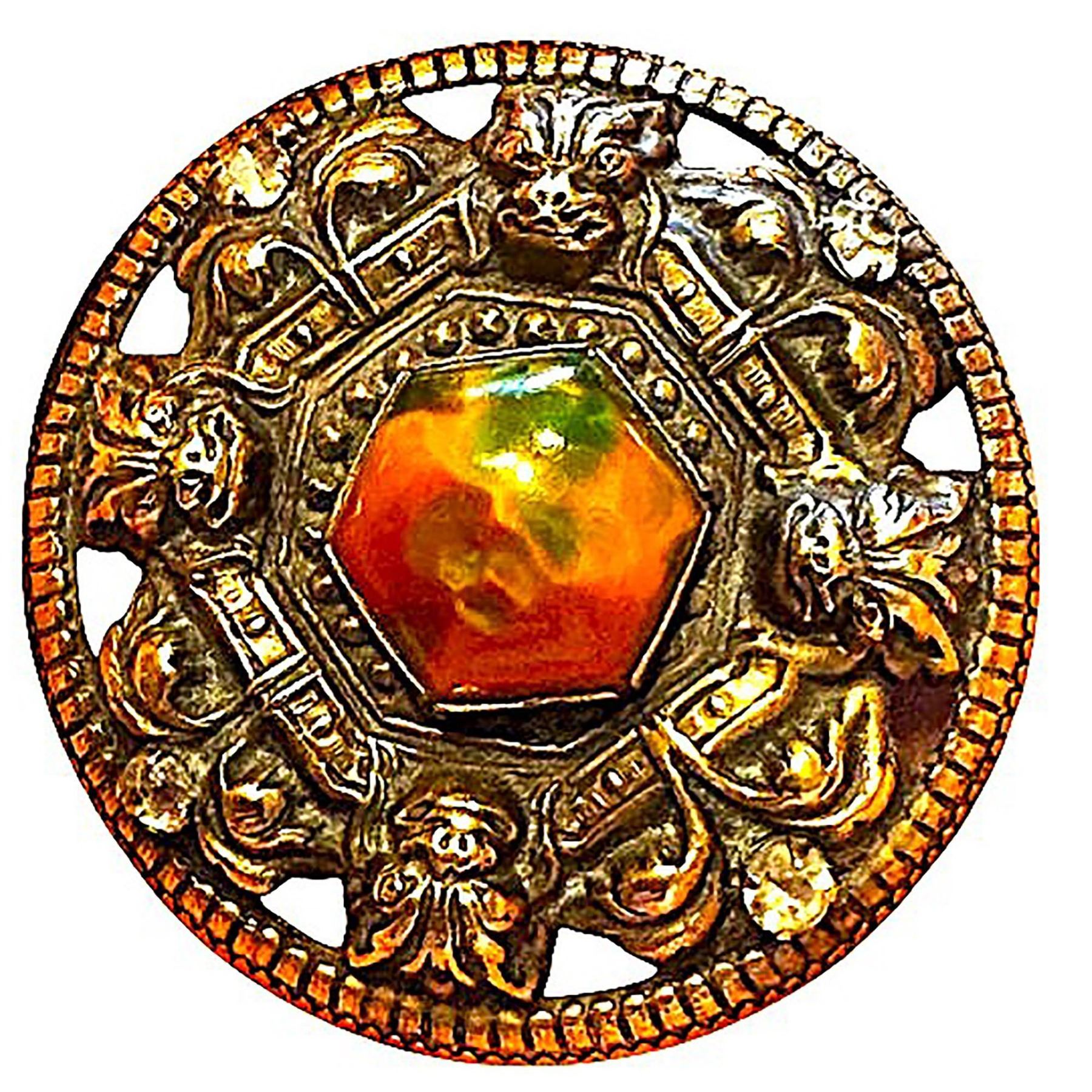 1 Large 19th century intermixed glass and pictorial button. This pictorial Gay 90 depicts 4 wildcat heads on a pierced brass setting and accented with a six sided multi colored cabochon jewel center. The brass setting is pierced and the 6 sided jewel is more unusual to find on this Gay 90 wildcat head button. Very nice.