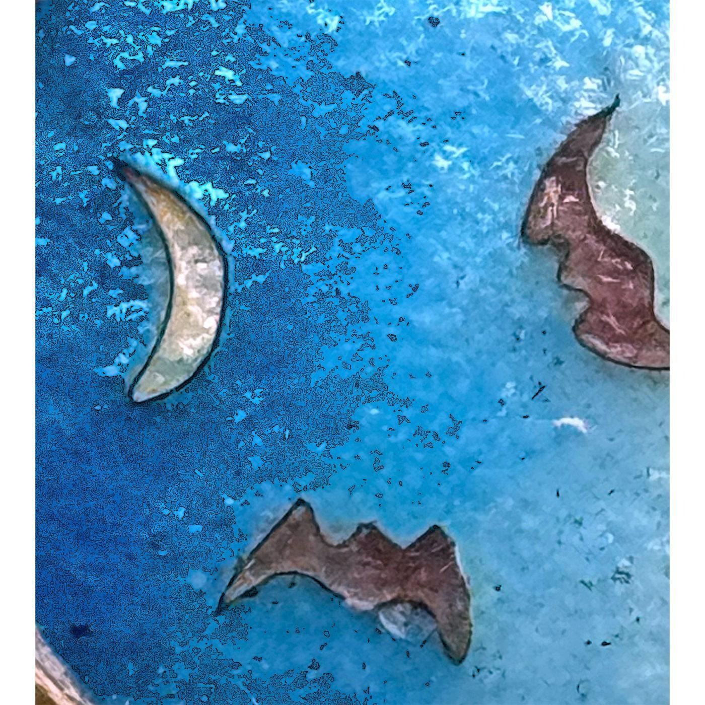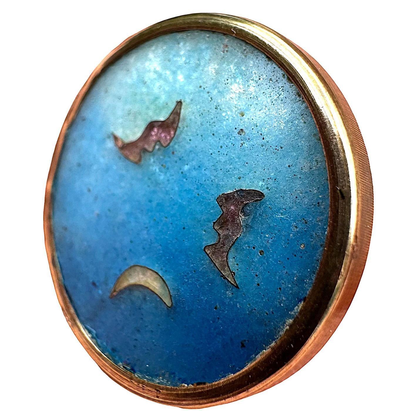 1 Medium size late 19th C. foil enamel known as Gin Bari work. This beautiful Japanese button is done in the Gin Bari technique on a deep blue sky colored background depicting 2 BATS and a MOON. Very unusual subject matter here. Gin Bari pictorials like this do not come up for sale that often and when they do they seem to go very fast. I have never seen Bats on a Gin Bari button before.