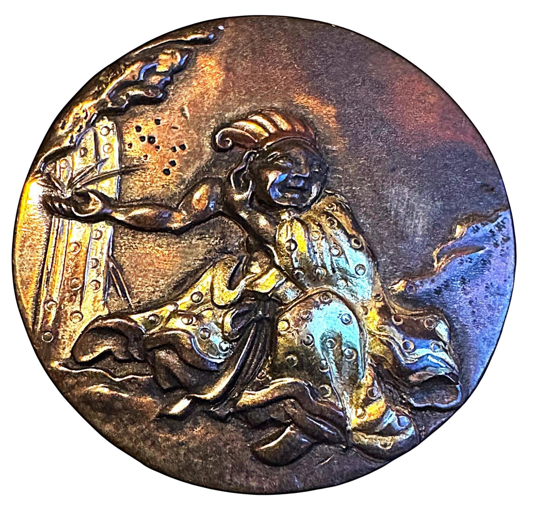 1 nice medium 19th century Shakudo example. Thanks to our own Tin Dang we have another explanation for this very cool and unusual Shakudo button. In Japanese folklore the dragonfly is the symbol of courage, strength and victory for the Samurai. The dragonfly is also a symbol of happiness, good luck and successful harvest in a farming country. This example shows what appears to be the Emperor Yuryaka who was saved by the dragonfly (as be is holding in his hand) and leading him to name the country Akitsushima (meaning dragonfly Island). Notice the robe, headdress and shoes on him which suggest wealth and therefore an Emperor. This is an unusual and fine example of Japanese metal works and in fine condition with lots of gold.