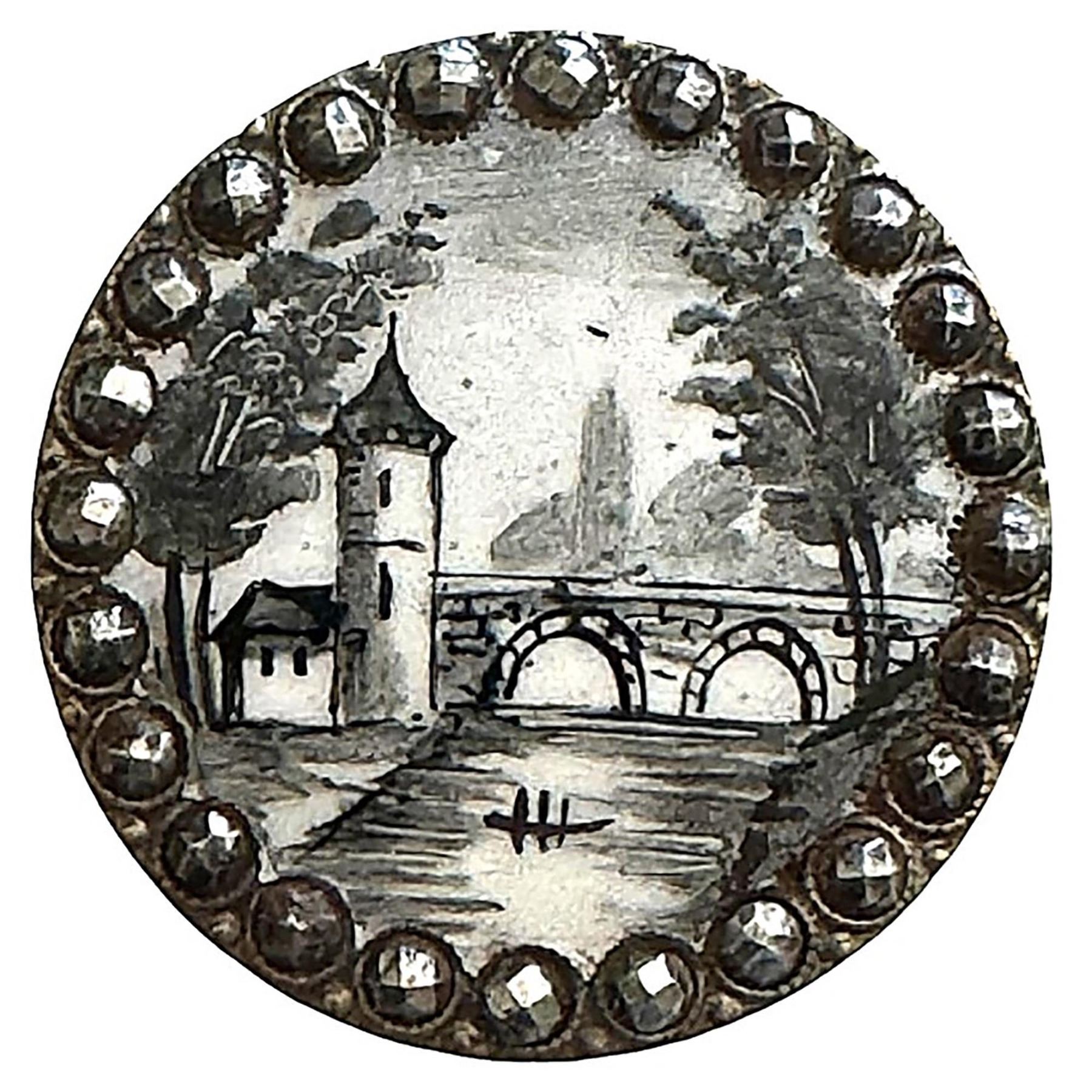 1 large 19th C. black and white architectural enamel scene. Here is a beautiful example for a monochrome enamel with great detail. The enamel has a cut steel border and is in fine condition. This is a very large example for Monochromatic buttons.