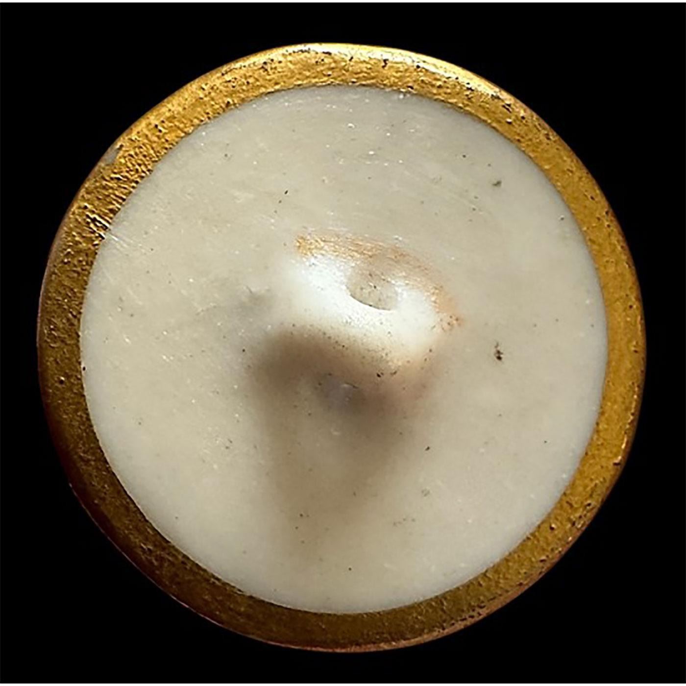 1 large medium 19th century "Pate Sur Pate" pinecone button. This is an gorgeous example from the Minton's factory in England in the late 19th or early 20th centuries. Pate sur Pate is a technique that is rare on buttons meaning Paste on Paste. It is a technique whereby the artists would apply multiple layers of slip (liquid clay) to an unfired, unglazed base. There are examples that have been called this technique but recently the classification committee of the NBS has decided to declassify these example as Pate Sur Pate, however we will tell you that our ceramic experts would disagree with that determination as the French examples we are talking about certainly appear to be of the same technique. You can see one of those examples in this auction of the ladies head. Whatever the determination is this example is considered such and even any of the others that the NBS say are not are still wonderful and hard examples of beautiful porcelain work from the late 19th century.