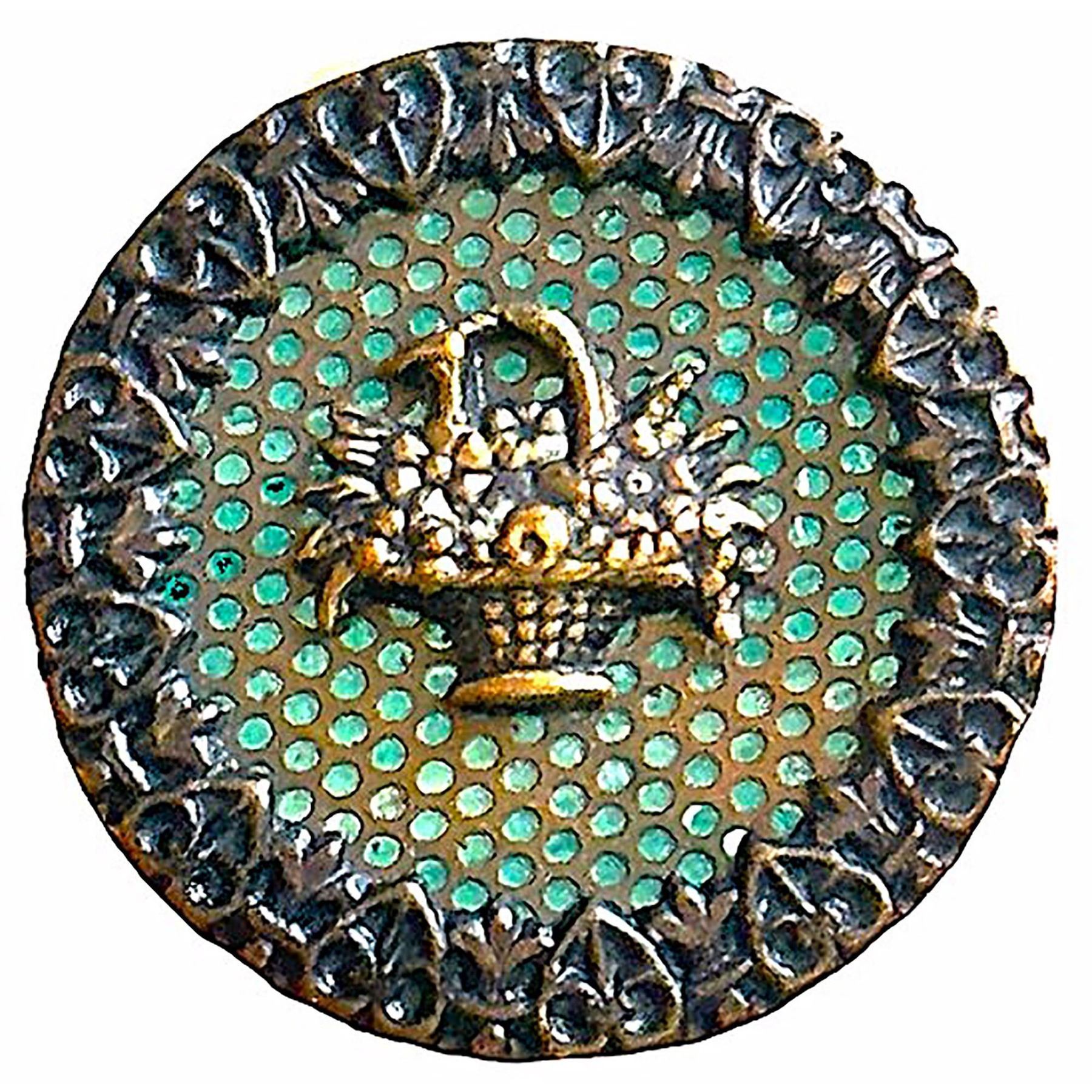 1 Large 19th century tinted background screen background example. This is a beautiful, rare to find in this condition, and unusual example to find. The colorful green tinted mirror background sits behind a screen background upon which an escutcheon of a basket of flowers sits. The border is ornate and detailed as is the basket of flowers. A very cool example in fine condition.