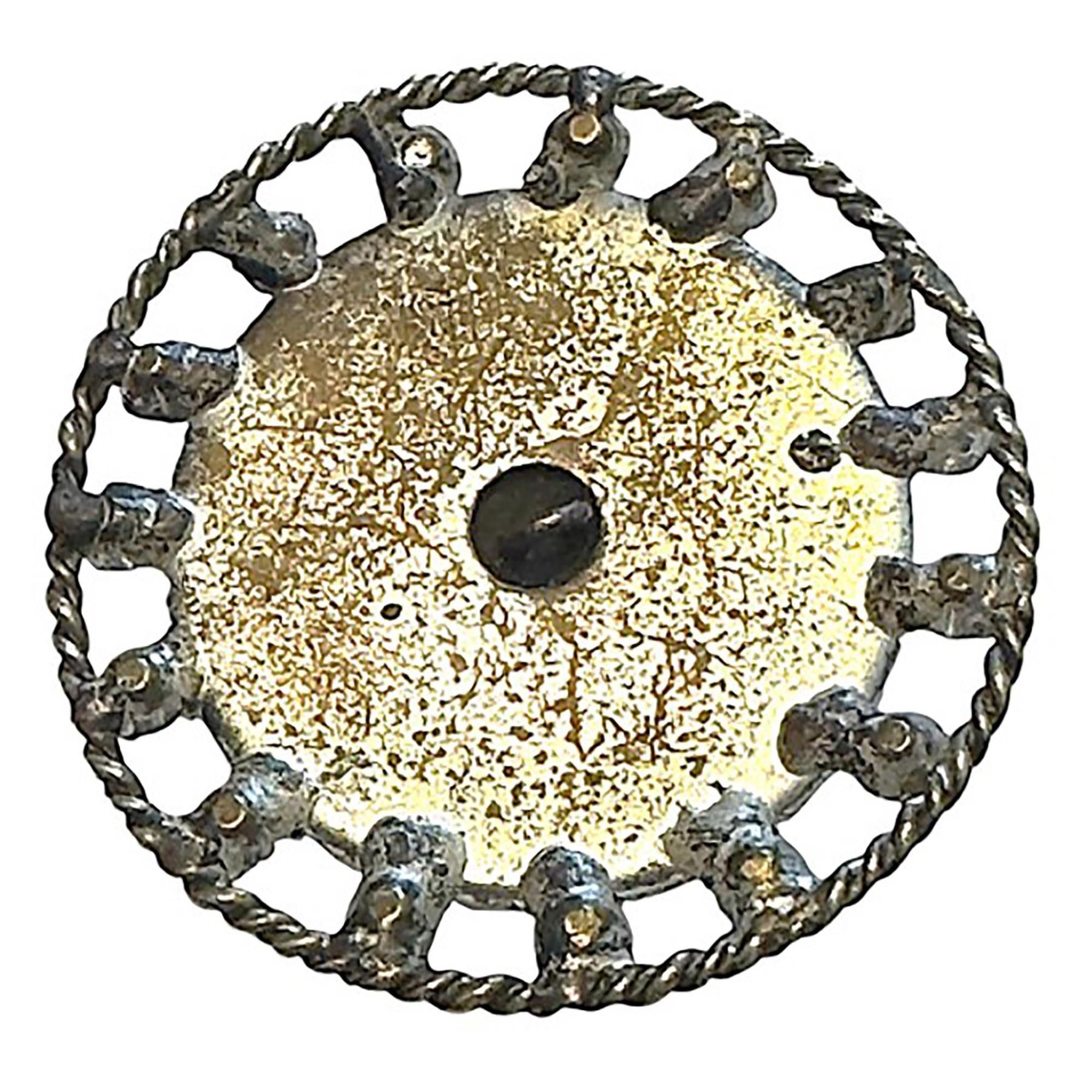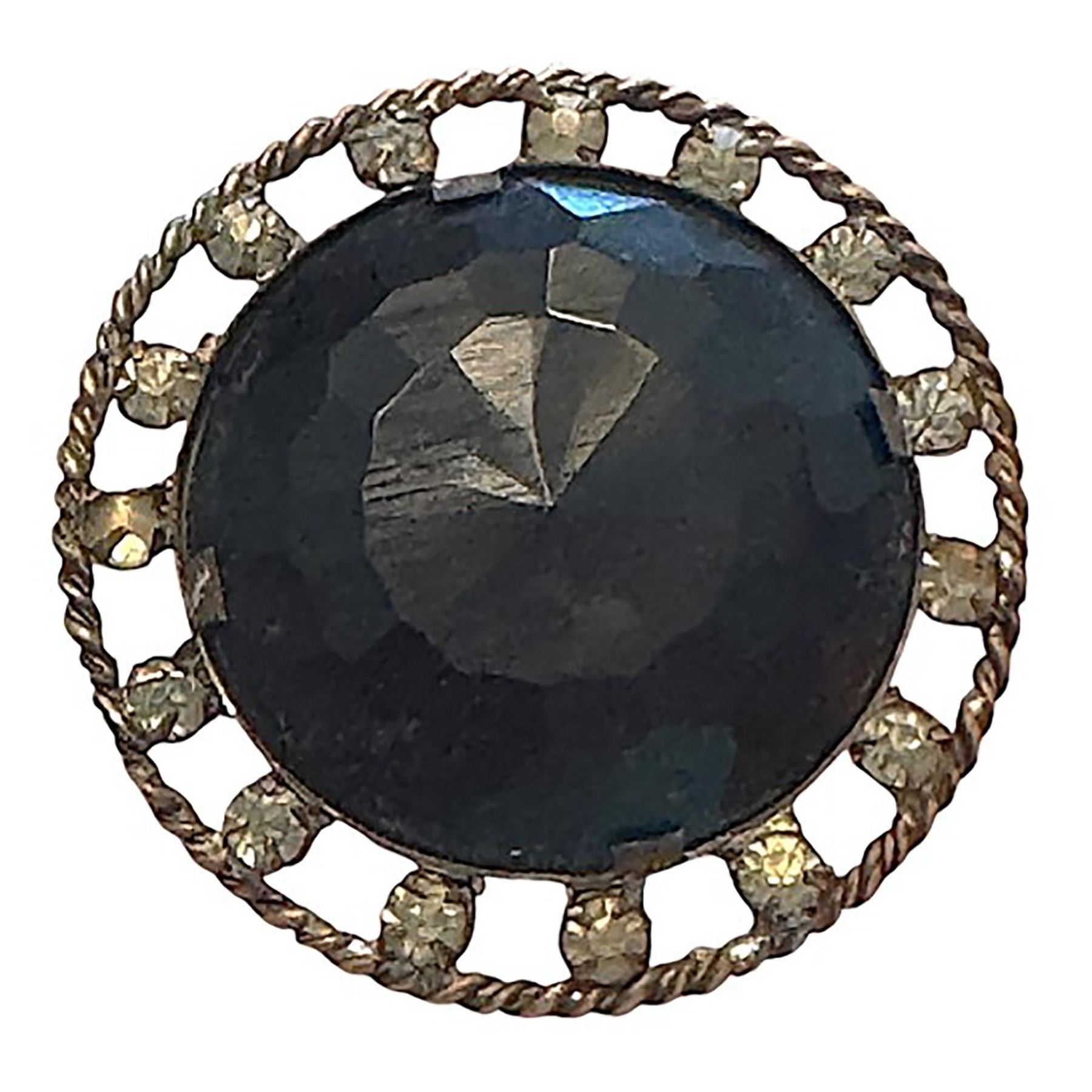 Here is a nicely made 19th century example of faceted black glass in high dome set in a brass mounting with a pierced border and accented on the border with brilliant paste jewels.