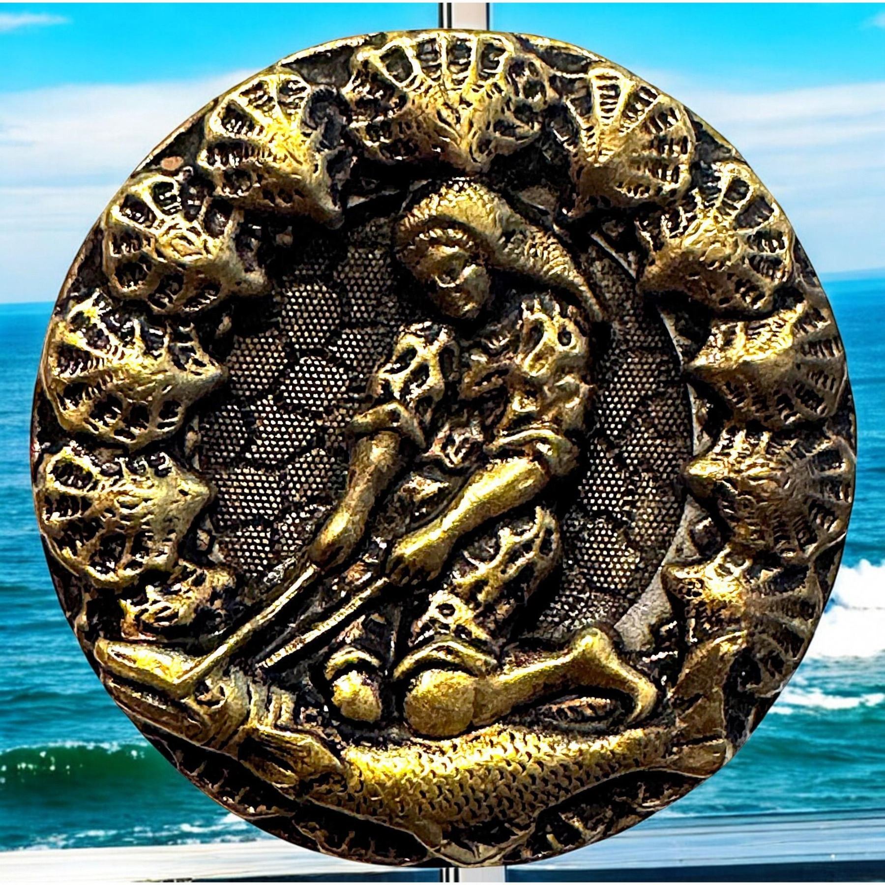 1 Large 19th century button known as "Tobias Riding a Fish". This very detailed and crips example can be seen in the BBB on plate 247 #23. The example has a textured background and a very cool realistic shell border, and is backmarked.