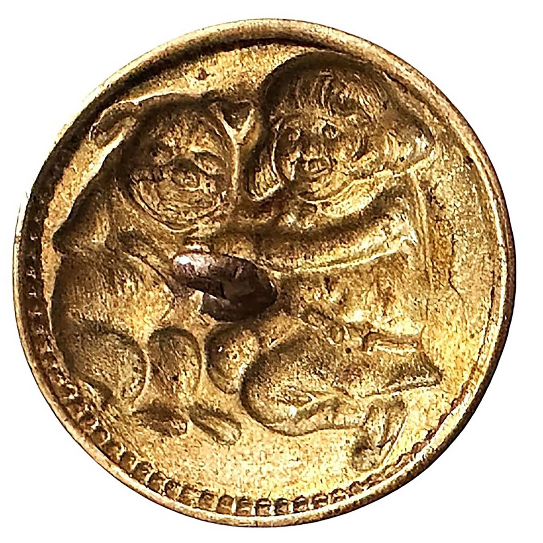 1 Medium early 19th century button of "Buster Brown and Tige". This button was made shortly after the book with these two Characters debuted. The detail of the faces of this child and his dog are quite nice and a fun button to own.
