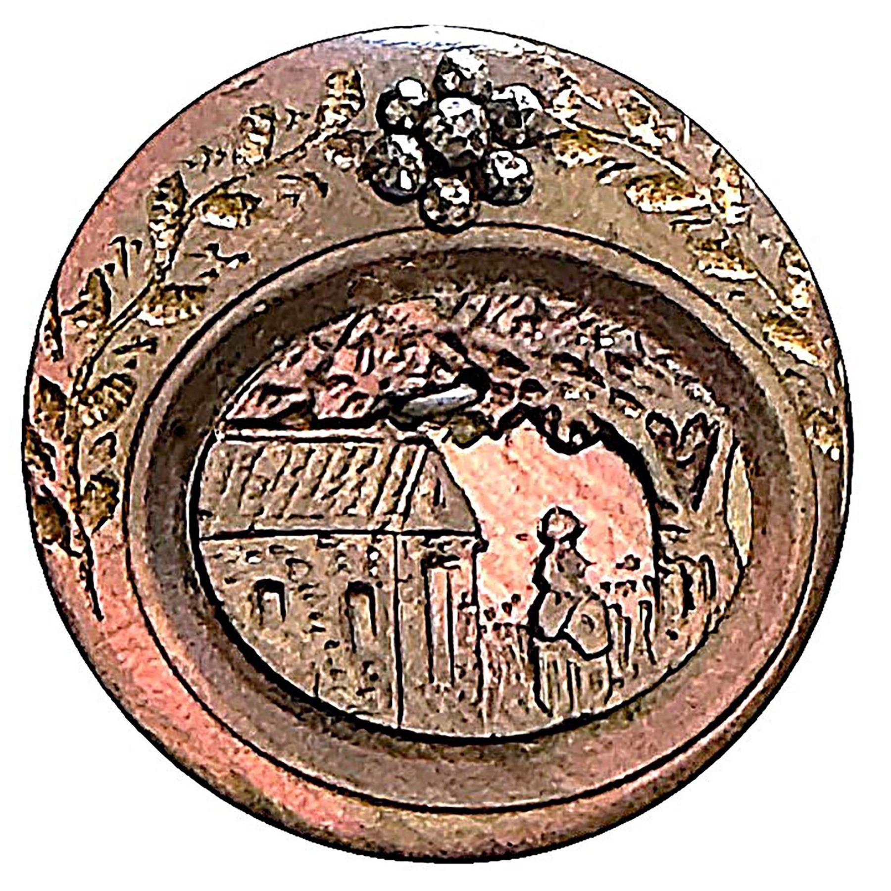 1 1 1/4" Medium size 19th century inset carved scene example. This is a very cool and beautiful coloration pearl button. The scene is cut back into an oval center of the button and accented with a floral engraving and cut steel embellishment over the top of the oval scene. Very nice and detailed button. From the collection of the late Shirley Case.