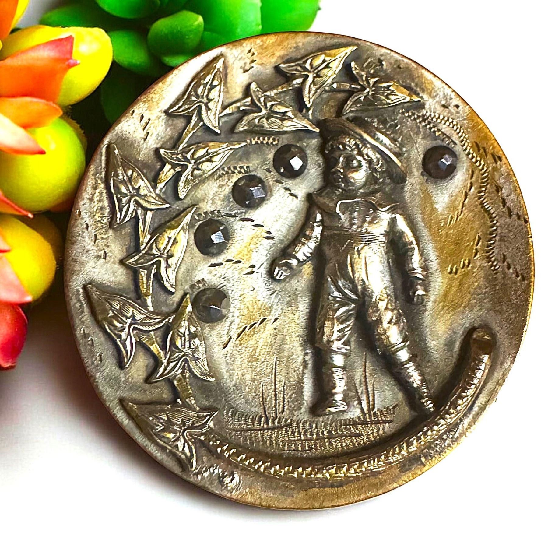 1 Large 19th century Kate Greenaway design example. This is a wonderfully detailed version of "Johnny and the Vine". Accented with cut steels on this great Kate Greenaway designed button.