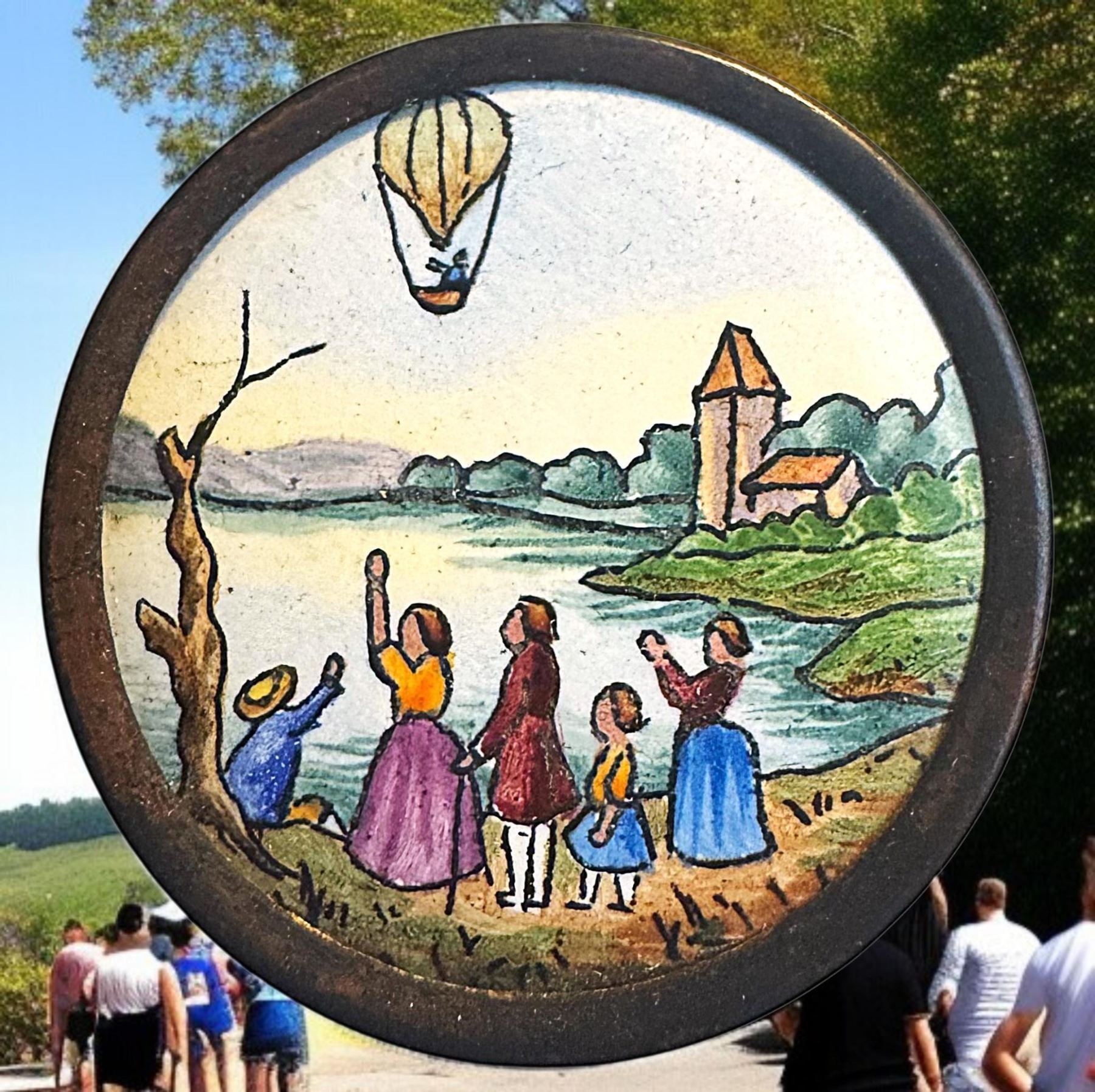 1 Large late 19th century example with a hot air balloon. Here is a wonderful and detailed polychrome enamel plaque inset into a brass mounting depicting a scene of people waving goodbye from the shoreline to the hot air balloon and its passengers. Very beautifully executed and detailed example.