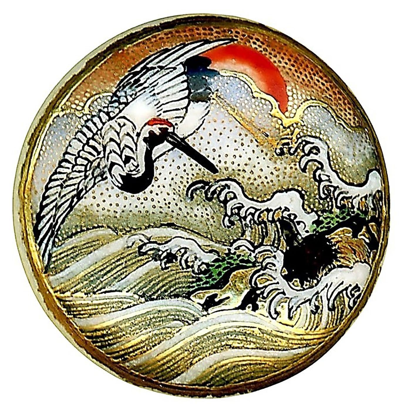 This detailed Satsuma button with lots of gold depicts a meaning that our Tin Dang has once again explained for us the meaning of the depiction. The Crane in flight represents the faithful people, the red sun represents the symbol of the new beginning as Japan was called the land of the rising sun. The powerful ocean wave in this example represents success in your life. The entire meaning of the design represents good fortune and good wishes to the person being presented a gift. This button lot and two others in the auction are all from the collection of the late Pauline Lum of California. Notice the price sticker on the back image as these were purchased many years ago and obviously were prized in her collection. A very fine and scarce Satsuma button.