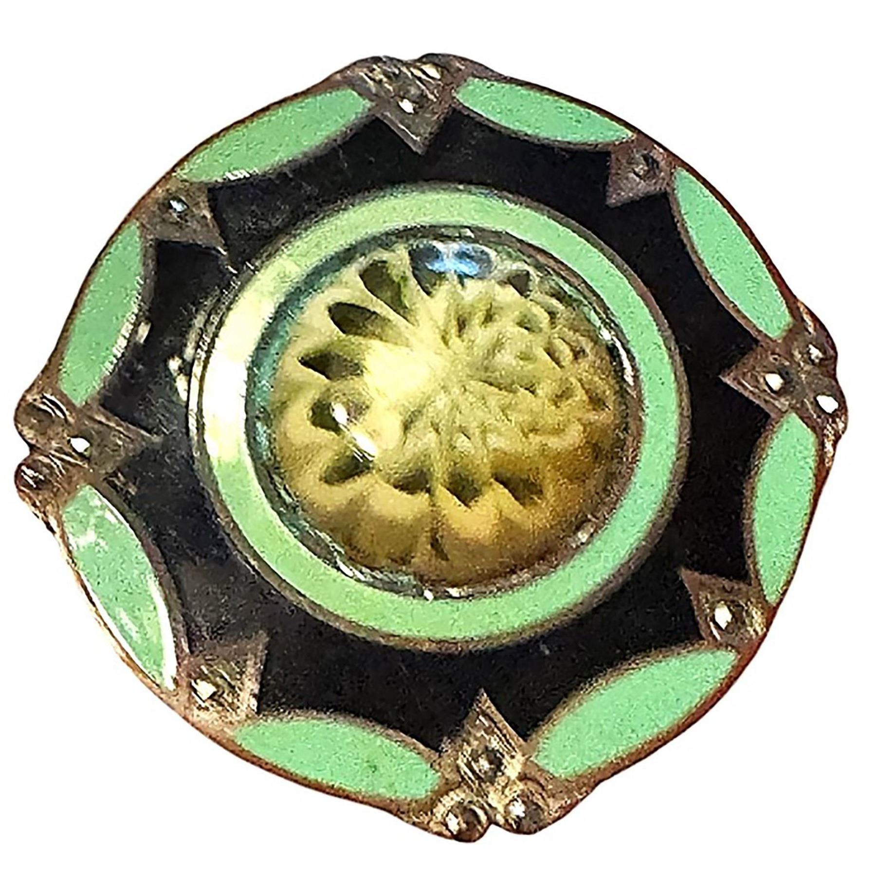 1 Extra large early 20th century example in a colorful enamel. We found this to be an interesting and cool example of early 20th century enamel work, The soothing mint green enamel accented with the black enamel is quite stunning and the center is set with a pierced cut under celluloid patterned inset. The 4 corners are set with rare MARCASITE OME, (marcasite's have 6 facets only and steels will not have 6 facets). Jose Roman had this in his collection and says he always had positive comments on it when he used it in his competitions at NERBA. It is truly a stunning and wonderful button.