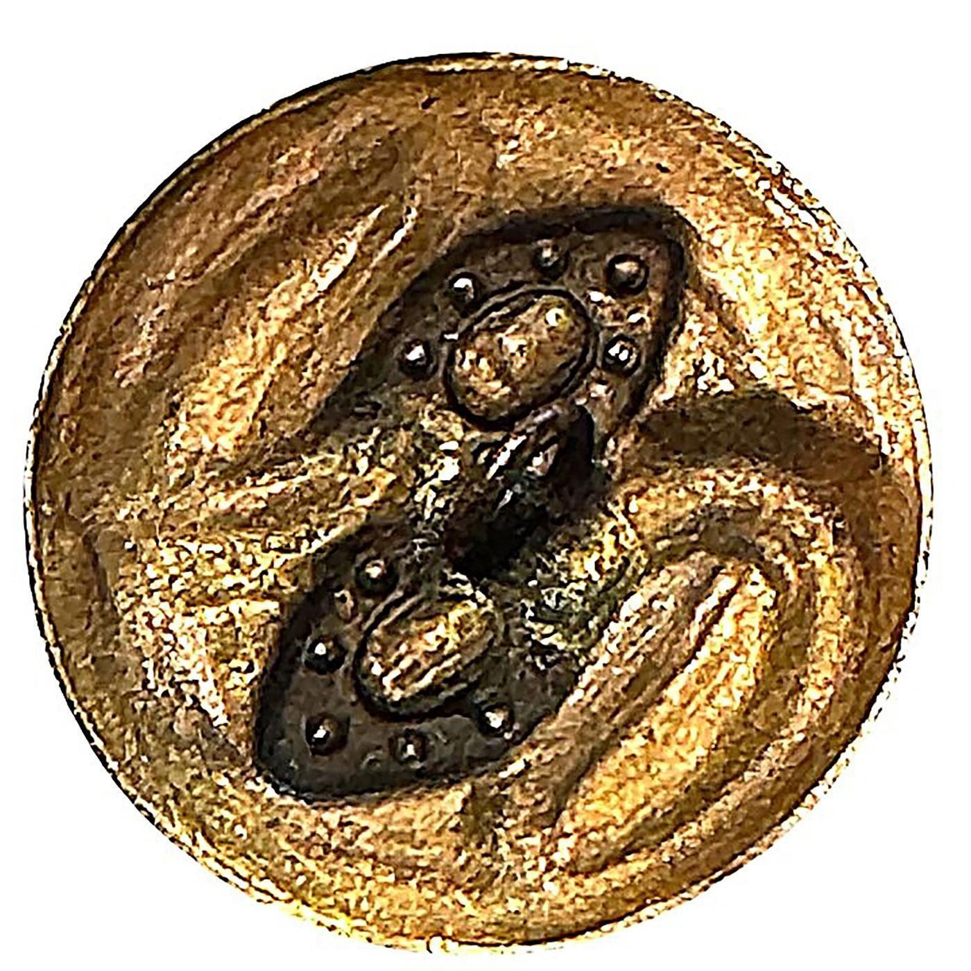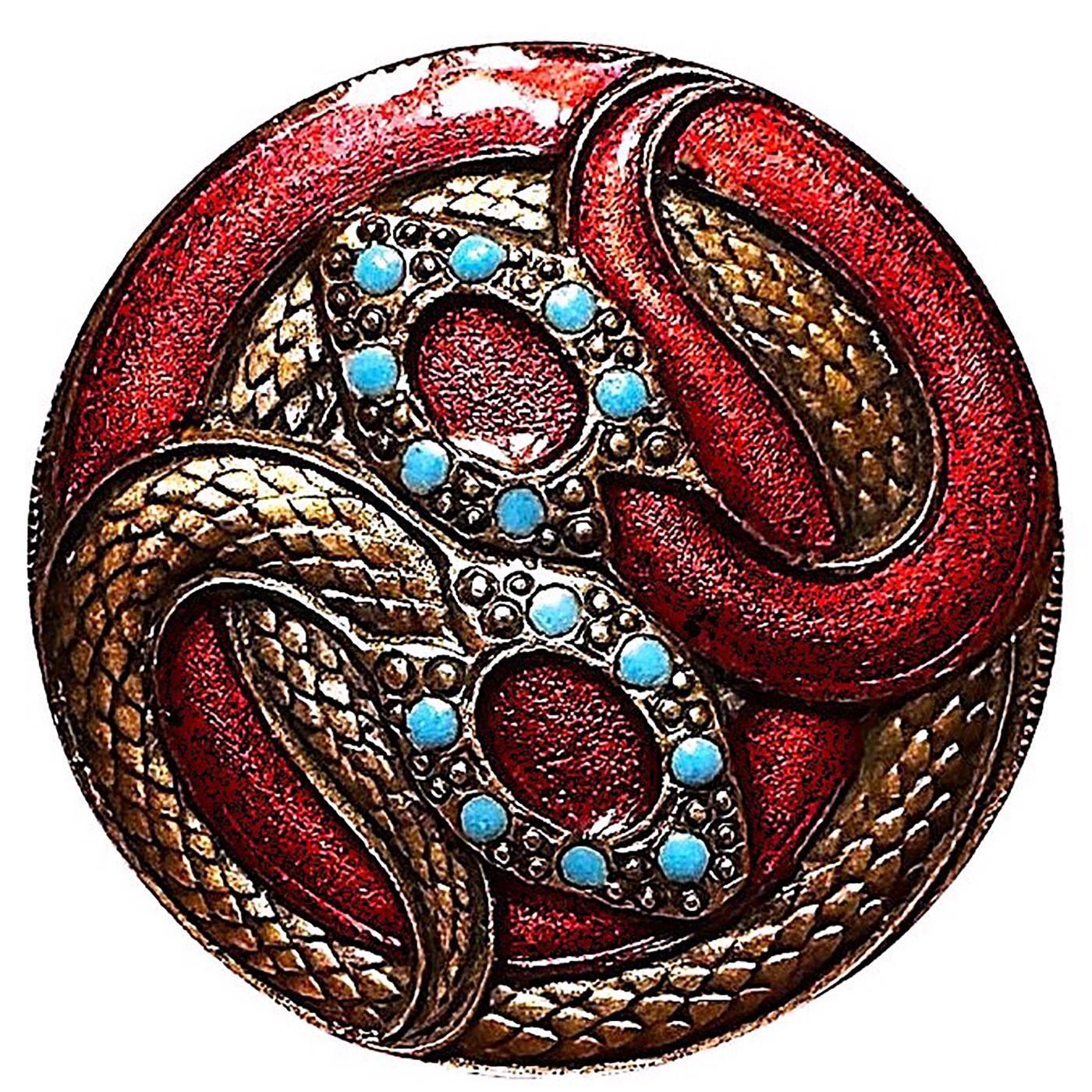 1 Medium 19th century coiled snake button. This detailed brass and red enamel coiled snake is accented with encrusted turquoise blue cabochons. A very striking button.