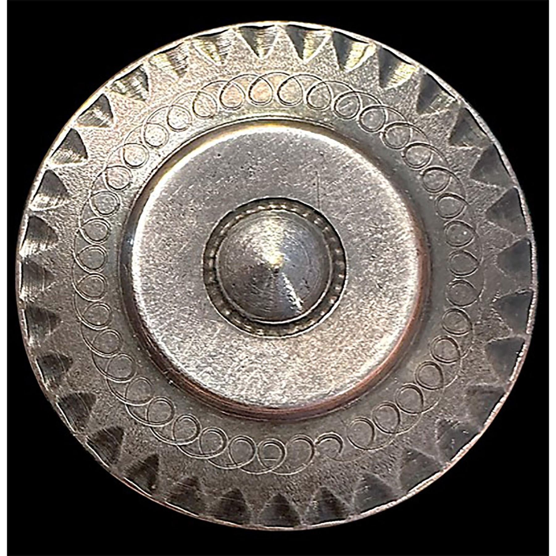 1 Large 18th century finely crafted button. We find this white metal button from the 18th century to be simple but very fine in its craftsmanship and engraving. The dimensional design and fine condition of this button Warranted its being sold by itself in our opinion.