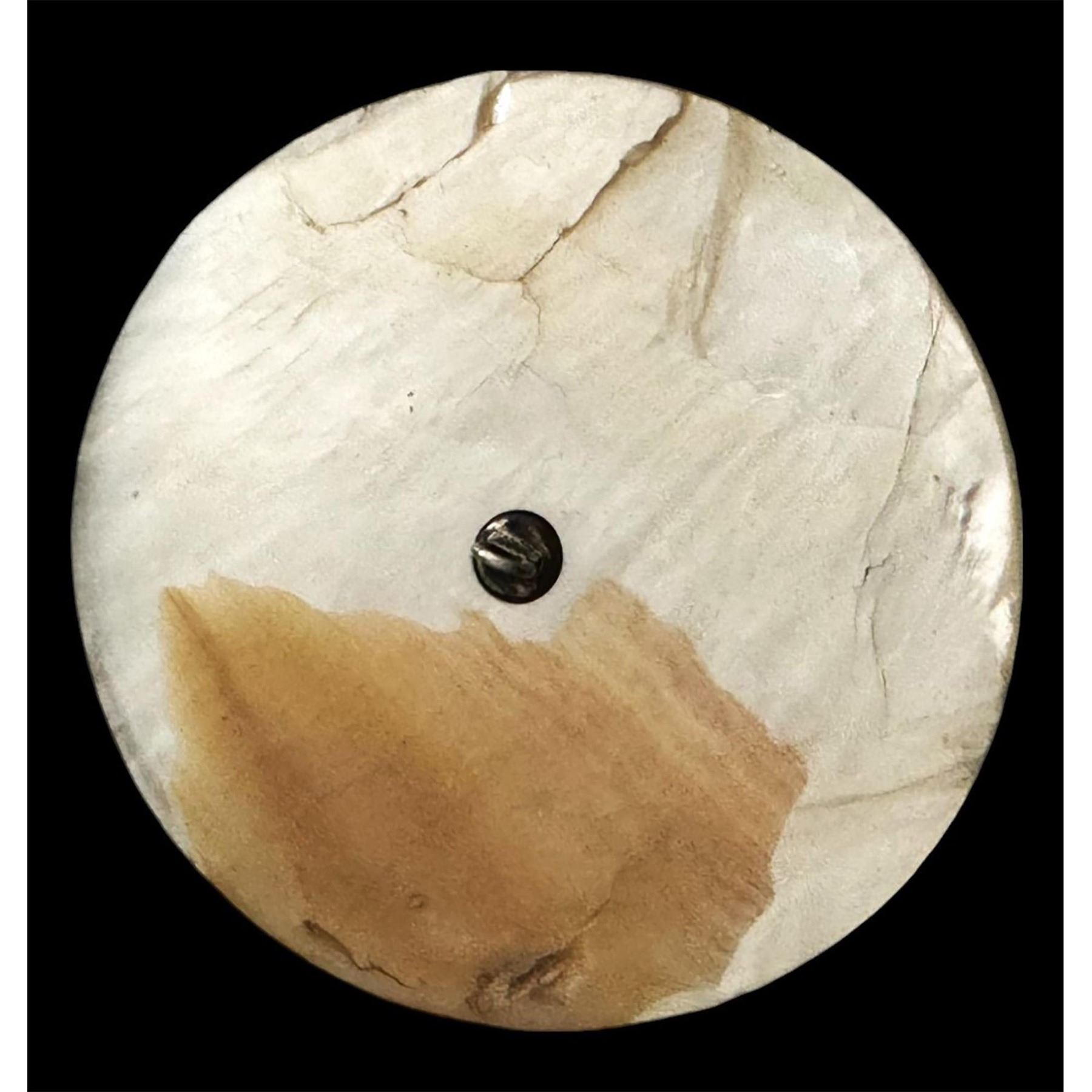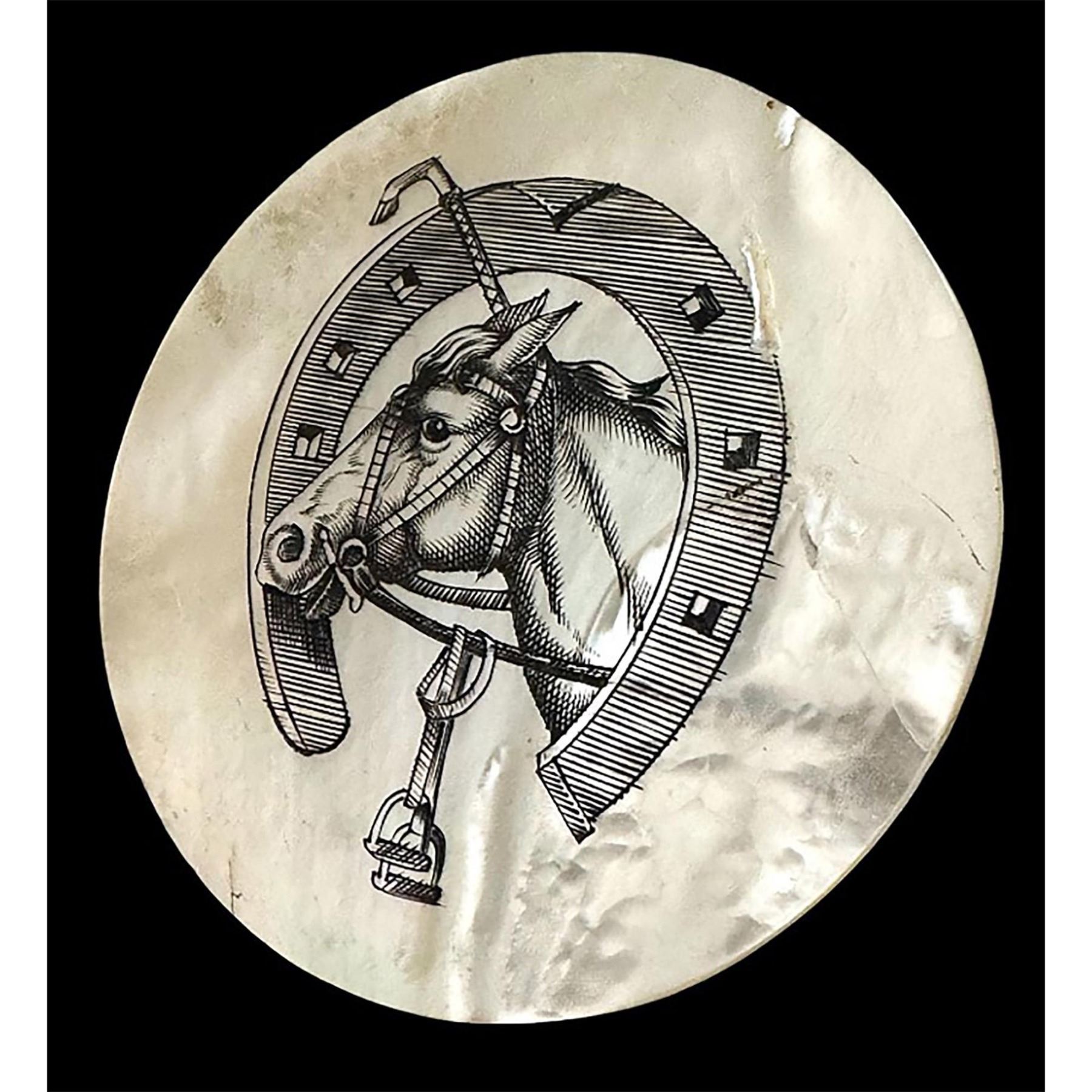 1 Extra :large early 19th C. Coachmen's pearl Equestrian button. This very thick pearl from the early half of the 19th century used to be considered from the 18th century. They are called coachmen's buttons because it was coachmen that wore these very large and thick engraved and pigmented buttons. Often they depict coaching scenes and sometimes sporting. This example shows a horse head inside a horseshoe which is a little less common than other pictorials in the coaching buttons. The engraving is very detailed and the black pigment has kept its vibrancy. From the collection of the late Jean Young of California. This is the largest example of a coaching button I have ever seen, incredible at 3" in Diameter.