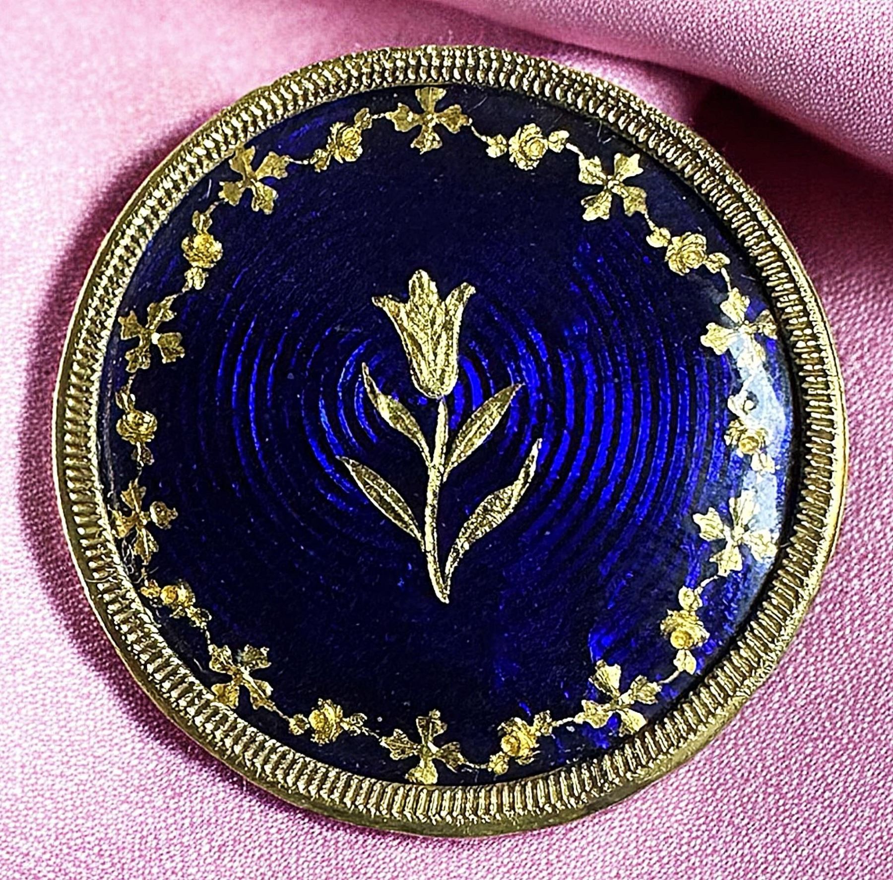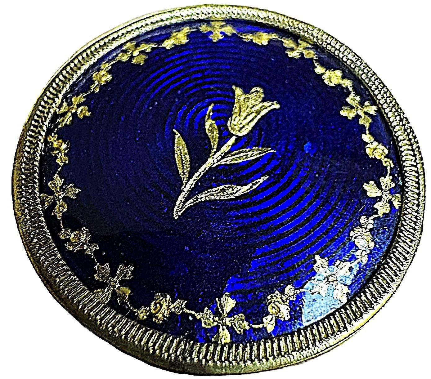 1 Medium late 18th-Early 19th C. Guilloche pictorial example. Another stunning example of enamel craftsmanship comes this beautiful cobalt background Guilloche (engine Turned) design with a bright gold foil floral center and a garland border in gold foil to frame the central design. Truly stunning. Set in a ornate bored brass mounting and back. This medium size is a harder size to come by than larger examples. From the collection of the late Dorothy Peterson of Virginia and a member of the Martha Washington Button Club.