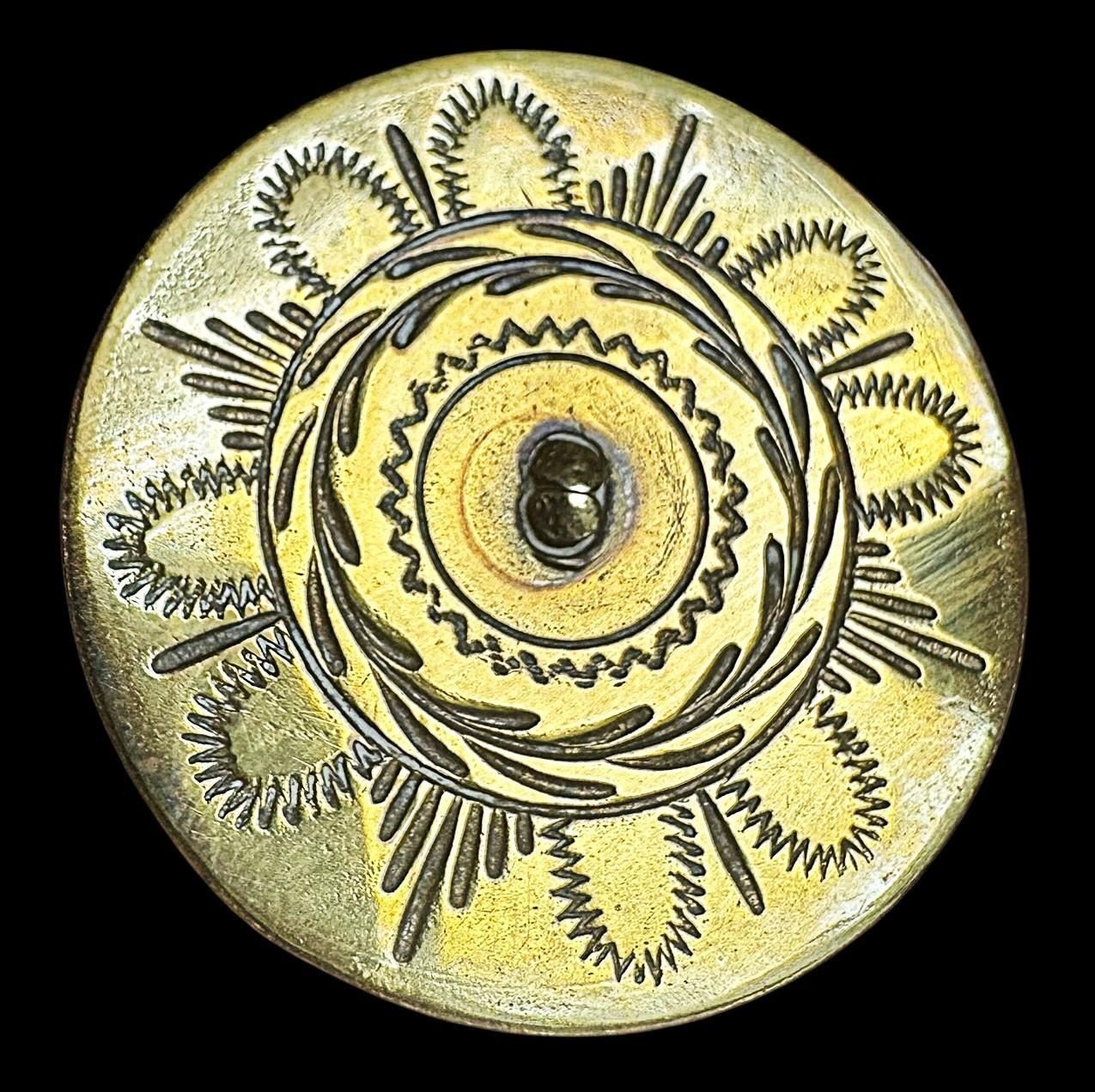 1 Large 18th century intricately hand made example. This example on the outside appears to be brass but may actually be brass or brass over copper. Whatever the base metal is, it is a very striking patterned design hand chased on this wonderful large 18th century button. From the collection of the late Dorothy Peterson of Virginia and a member of the Martha Washington Button Club.