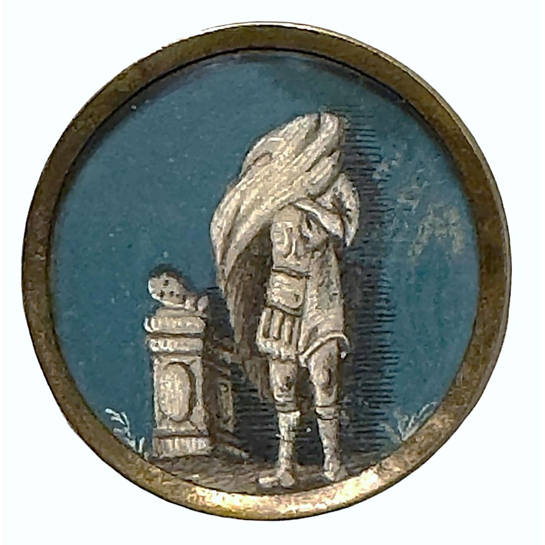 1 Large 18th century painting on natural material. Here is a beautiful blue background painted scene from a larger set originally imported from France in the button world by the George Ertell's. This is one of the examples that typically has more detail than others we have seen from that set. Very crisp detail and nicely executed.