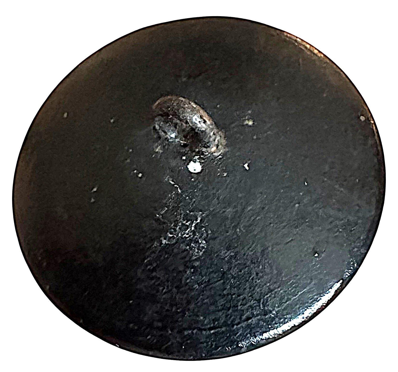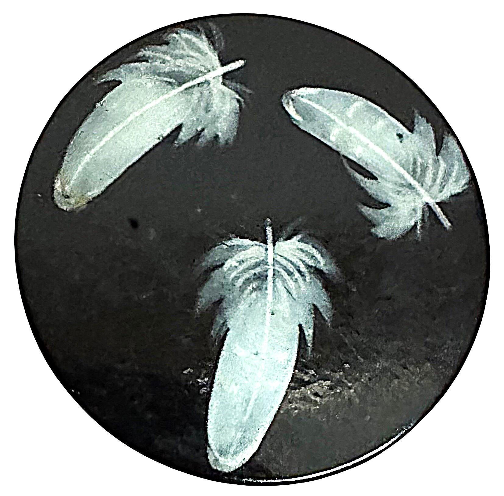 1 Large 18th century lacquered wood tri design example. This white and black decorated wood button is lacquered and decorated with a design of three feathers. Objects on 18th century are less common than all other pictorial examples.