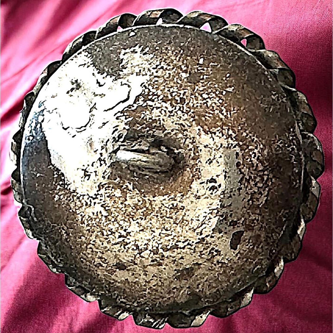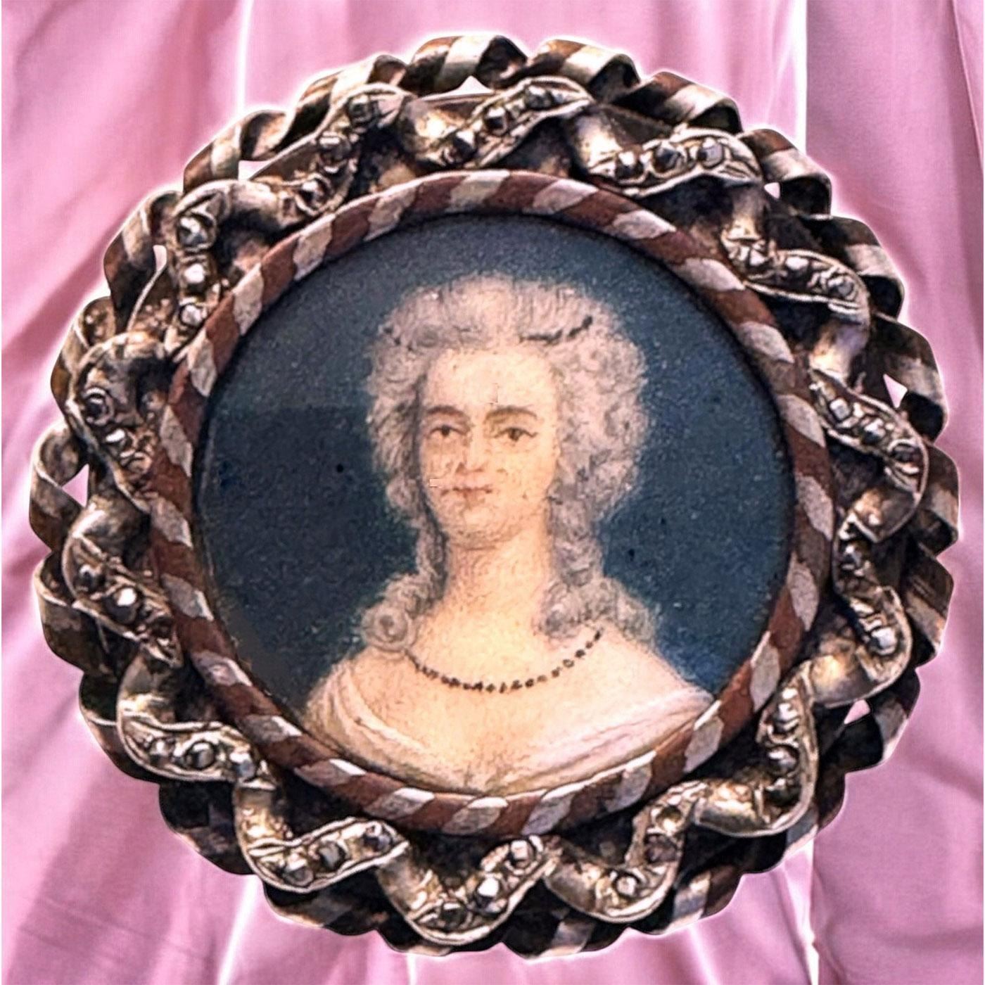 1 Large Stunning 19th century painting on natural material. This uncommon button has a setting that is Stunning framing a beautiful painting under glass center. The silver mounting is enhanced with an intertwined silver and copper inner border, framed by an outer intertwined silver and very fine cut steel border and then a final pierced twisted border on the far outside. The center is a hand painting of an 18th century detailed women with a necklace and painted on natural material and set under glass. The button dates to the first half of the 19th century.