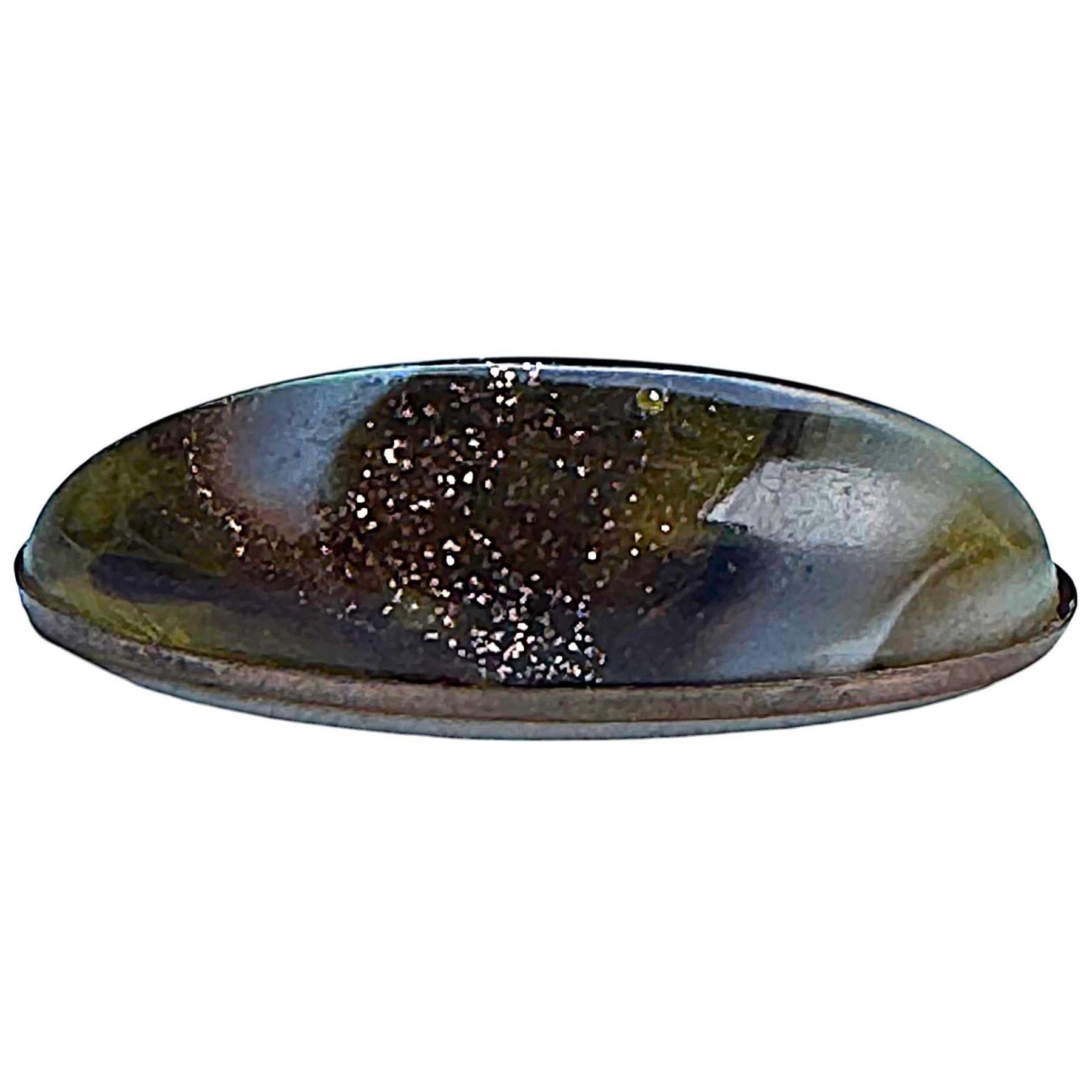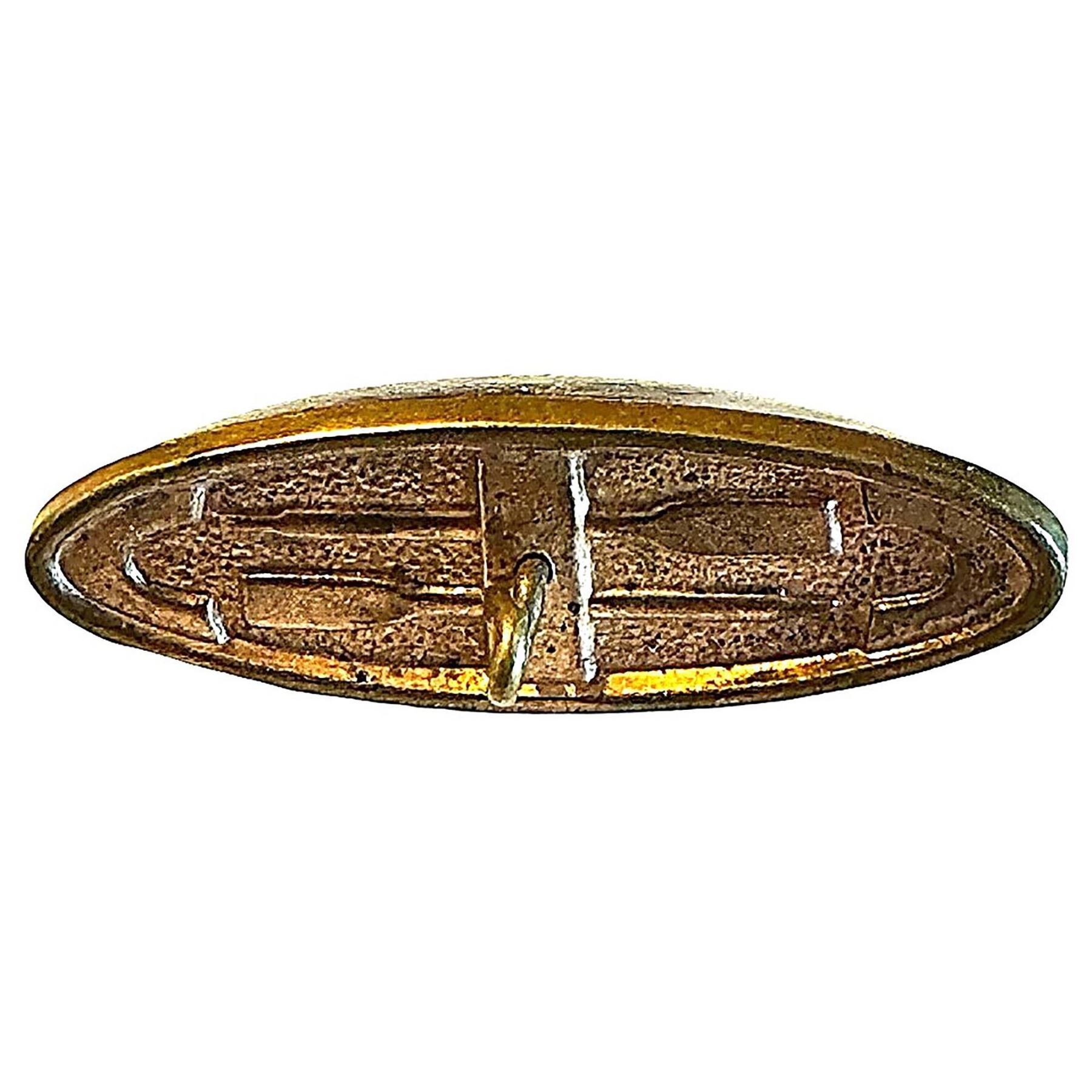 1 :large 19th century Boat shaped button with Oars on the back. This is such a cool and fun button. The brown intermixed glass is shaped actually like the bottom of a boat and the brass setting and shank back is molded with a pair of boat Oars. The intermixed glass is speckled with goldstone or aventurine as well. As I said very cool button.