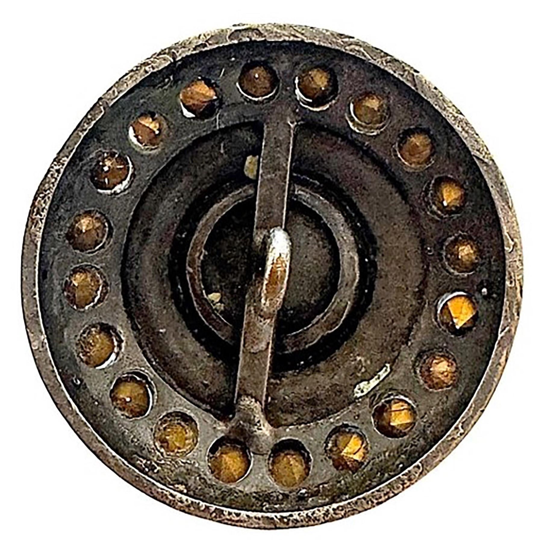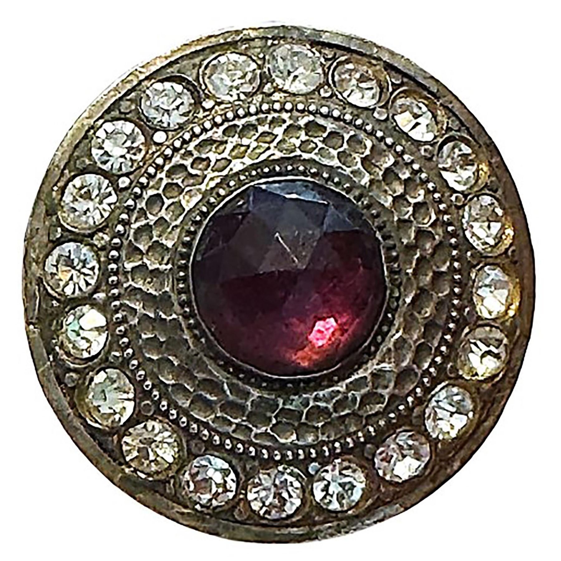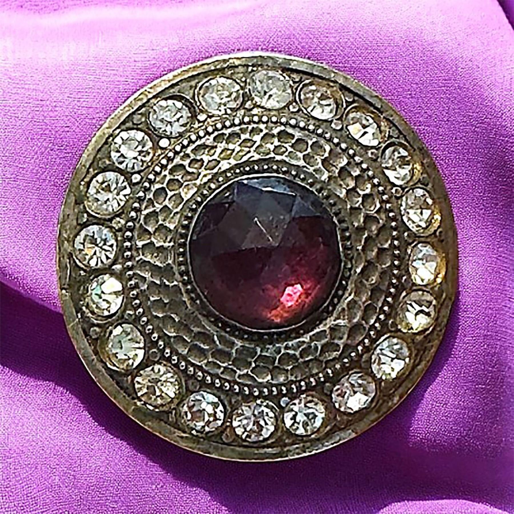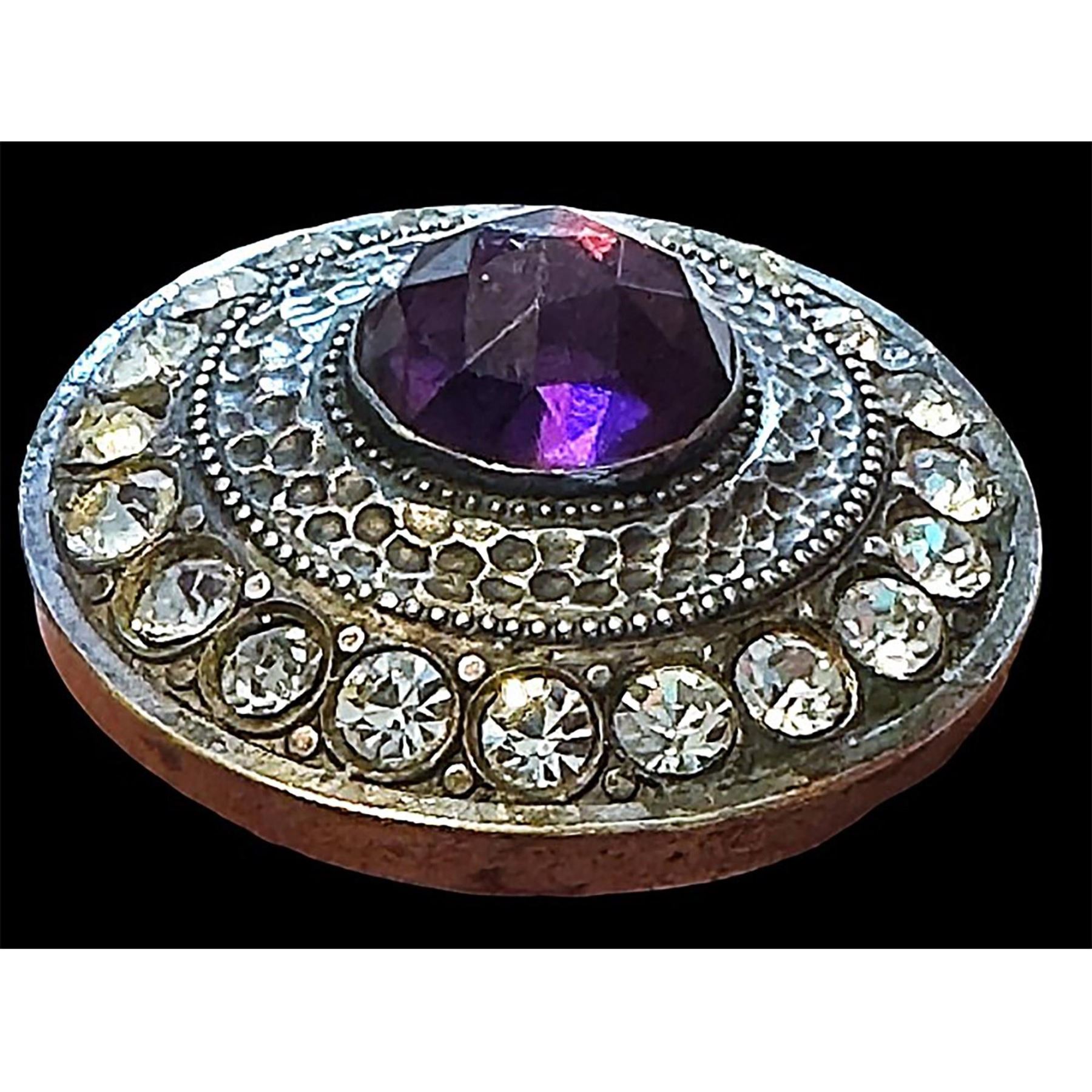 Here is a very lovely large jewel showing a large faceted purple jewel center set into a silvered brass mounting and bordered with brilliant cut paste jewels.