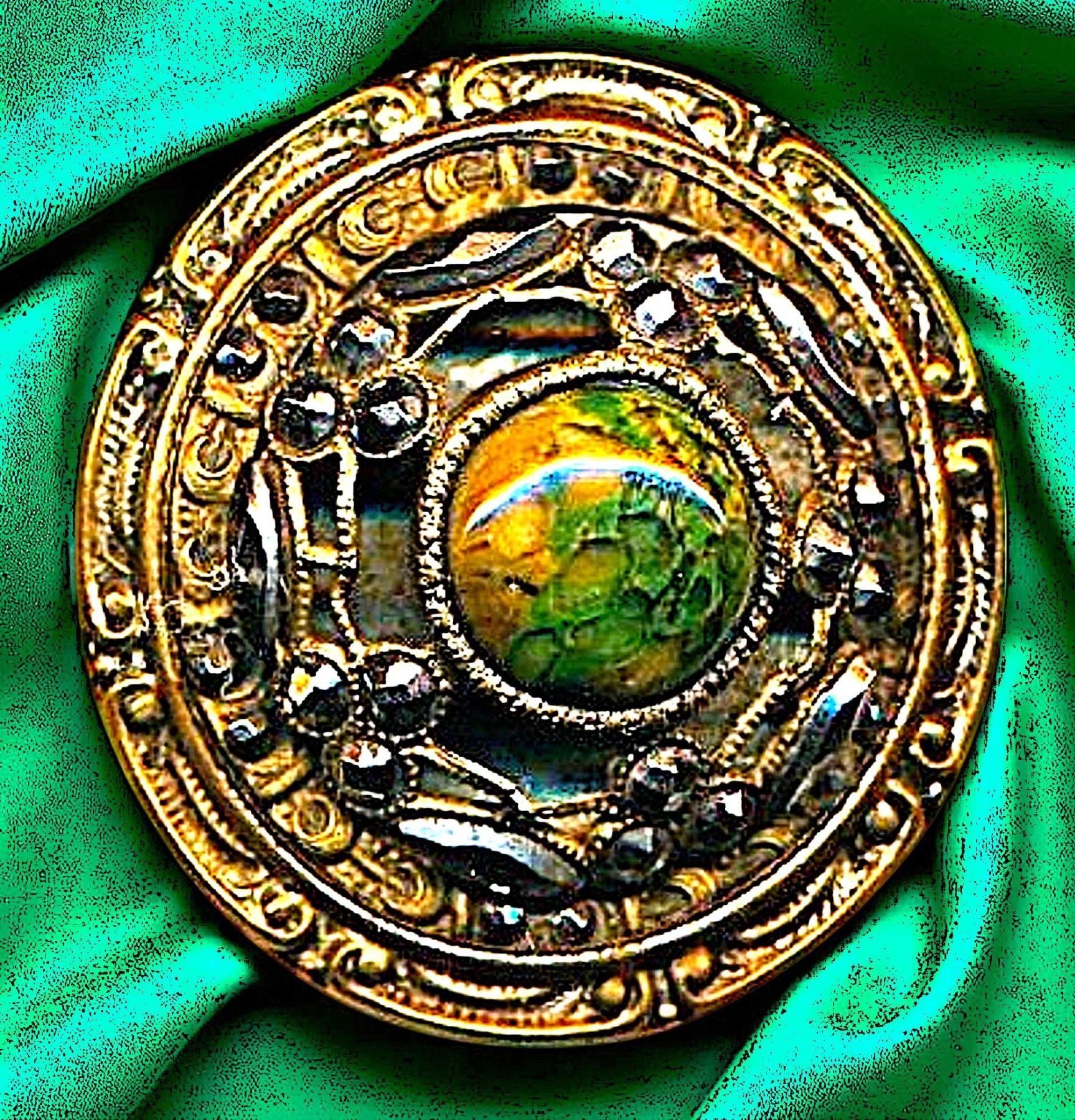 1 Large 19th century button in GAY 90 style. This beautiful cut steel OME example is set with a nice intermixed glass cabochon center. Some purists would not accept this as a GAY 90 because it has a closed back but one must keep in mind that the classification of the NBS states in the definition of Gay 90's, that they are often pierced, they do not say always. We believe the design, construction and quality in this particular example qualifies as a true Gay 90, you be the judge. Regardless its a beauctiful button whatever you think iys classification is.