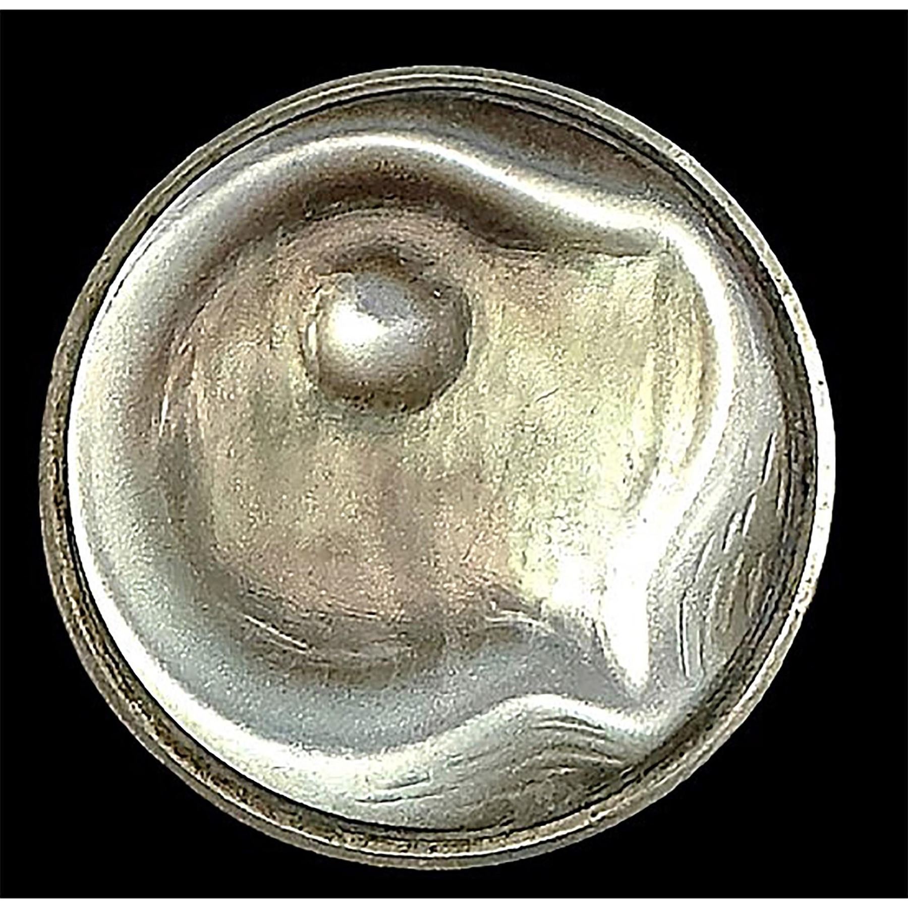 1 Large medium 19th century Art Nouveau style example. This beautiful understated example from the late 1800's was made during the Art Nouveau Era and shows the flowing design of the times. The natural pearl is beautifully chatoyant and set with a silver rim and brass back. From the late Shirley Cases collection. This is the large medium as large as a medium will go at 1 1/4"