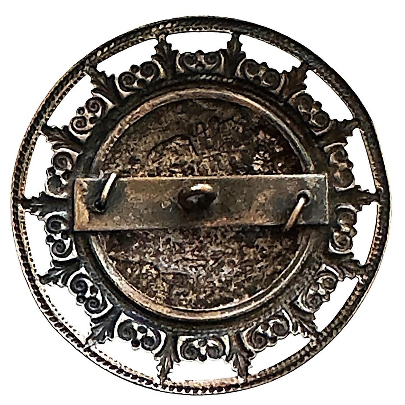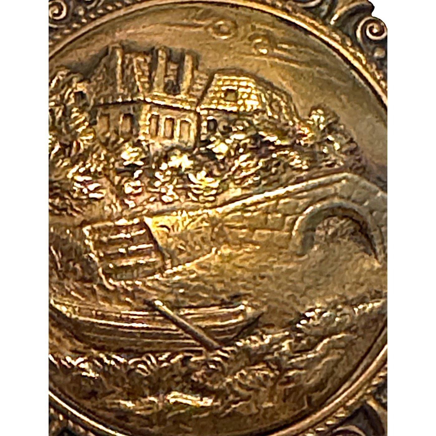 1 Large brass 19th century Boat & Architectural scene example. Here is a very detailed domed brass button with a pierced openwork border. The architectural scene shows buildings in the back, a bridge in the foreground and water and an empty rowboat. An unusual and scarce picture button to find. Very nice.