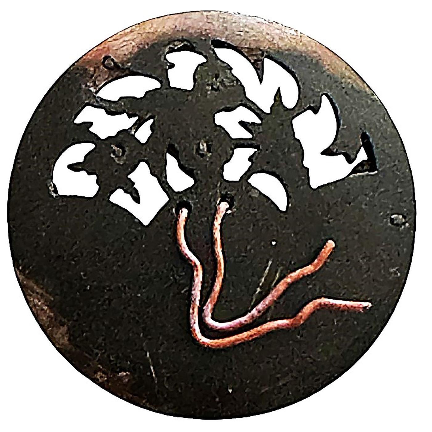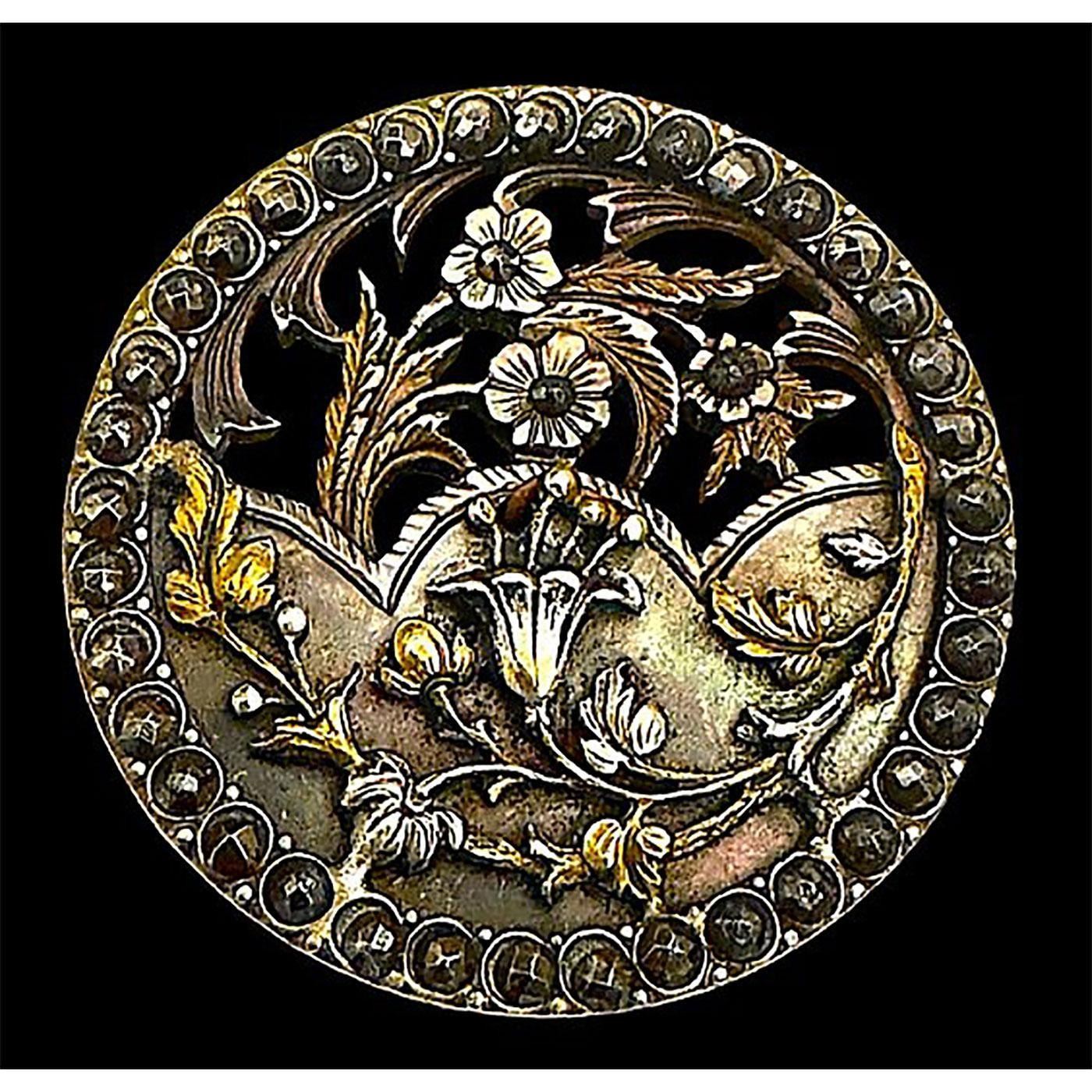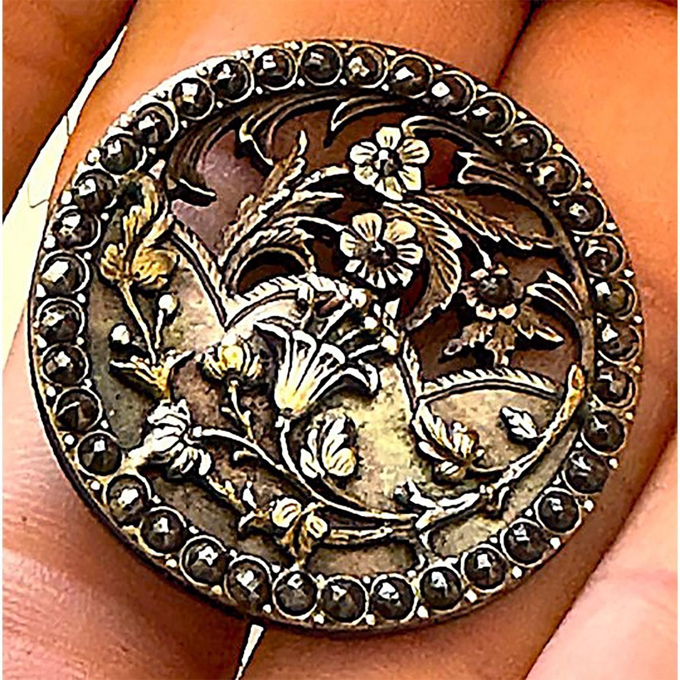 1 Large 19th century brass-cut steel-pearl button. This great button is one of three designs made like this that we know of. There is a Horse and rider, a Long legged bird and this floral. We have sold the other examples in our auction from the collection of the late Shirley Case and now this final example is up for sale. The base is carved and pierced openwork pearl which is capped over with a brass and silvered brass layer and applied and held it the pierced delicate pearl by means of cut steels and bordered with a cut steel border. The detailed and design are exquisitely done and in fine condition.