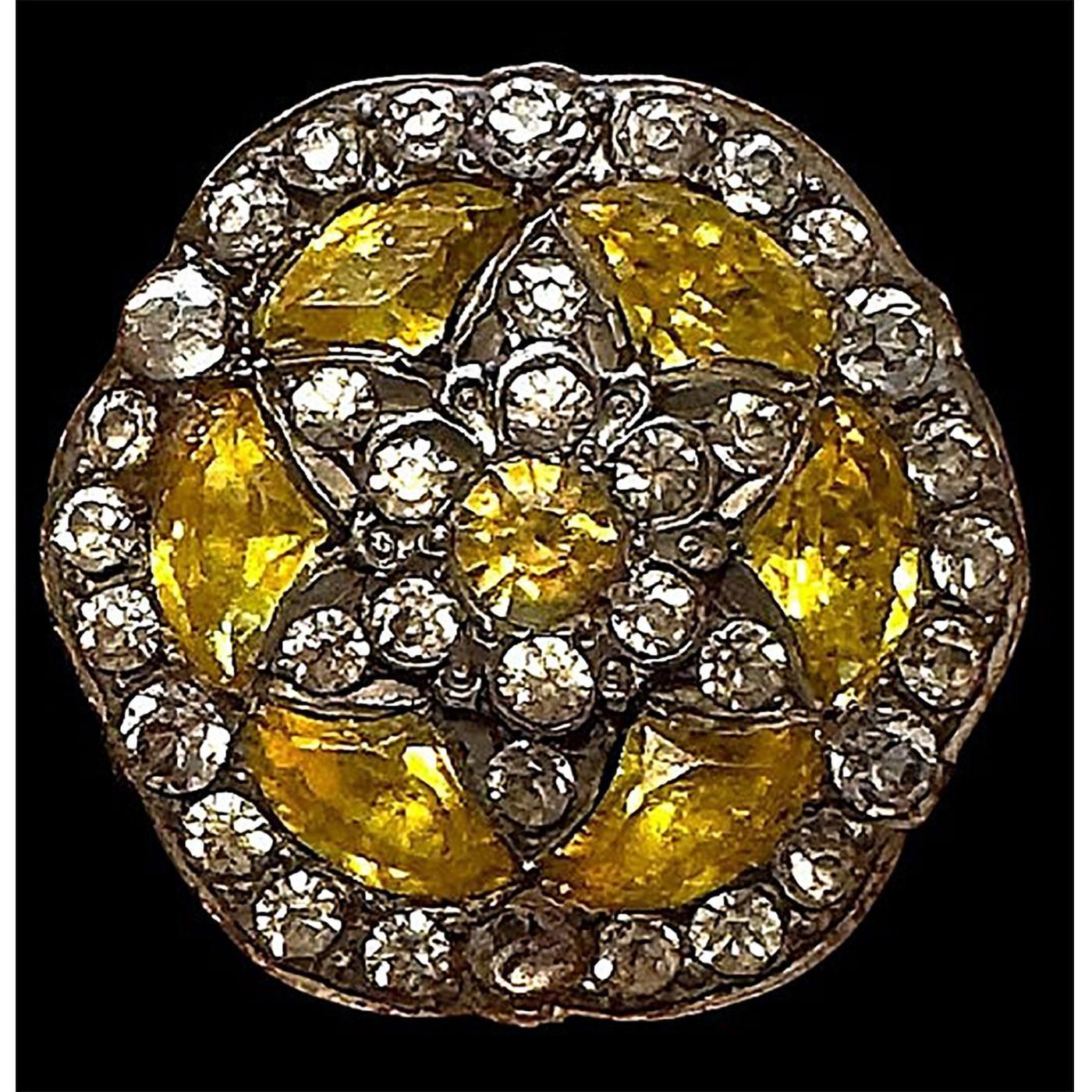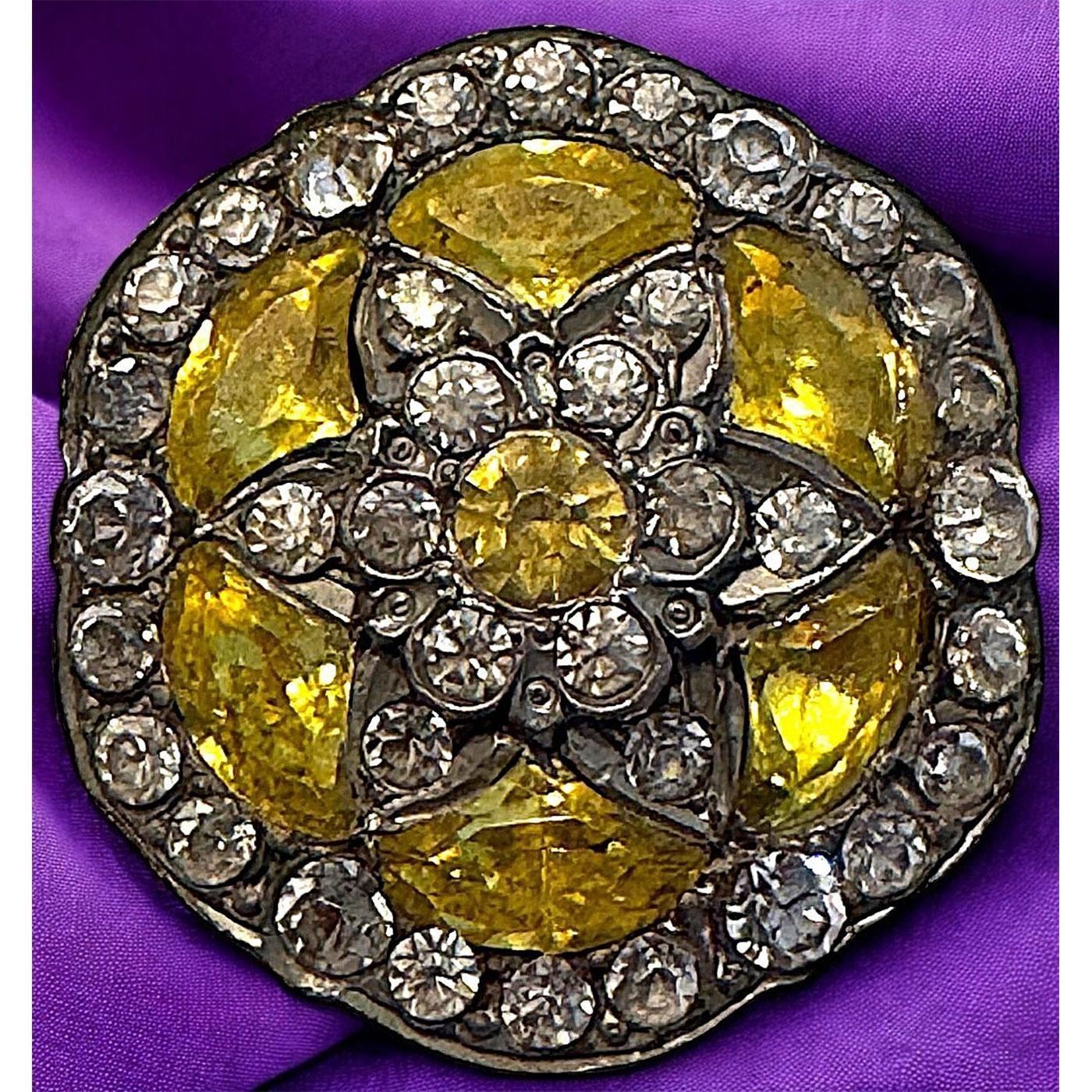 1 Large late 18th century Georgian jeweled button. These striking examples of Georgian jewels are always desirable among collectors, and this example is and should be even more so. Why, you might ask, is because these yellow faceted strass (crystal jewels are much more uncommon than any other color found on these examples, The beautiful clear crystal strass surround the 6 shaped large yellow jewels which in turn surround a more unusual STAR patterned center of clear crystal strass which finally surrounds a smaller round yellow crystal strass center. All mounted in a patterned back silver setting typical to these late 18th century examples. The yellow stones certainly remind us of yellow diamonds we see today. Exquisite and stunning button, useable on a pattern tray, glass in metal tray, 18th century tray and more.