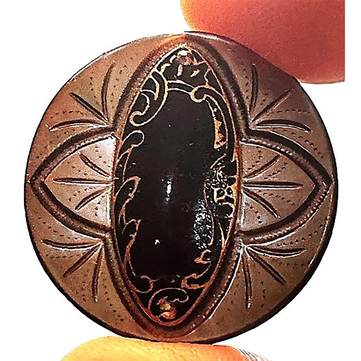 1 Large 19th century smokey pearl with oval enamel center. Here is a beautiful example of two materials on one button. The base is a heavily engraved and carved shaded pearl button with a beautiful oval/spindle black champleve enamel center. We sold a similar example in 2023 in one of our button auctions and perhaps the underbidder would like to try of this very nice example.