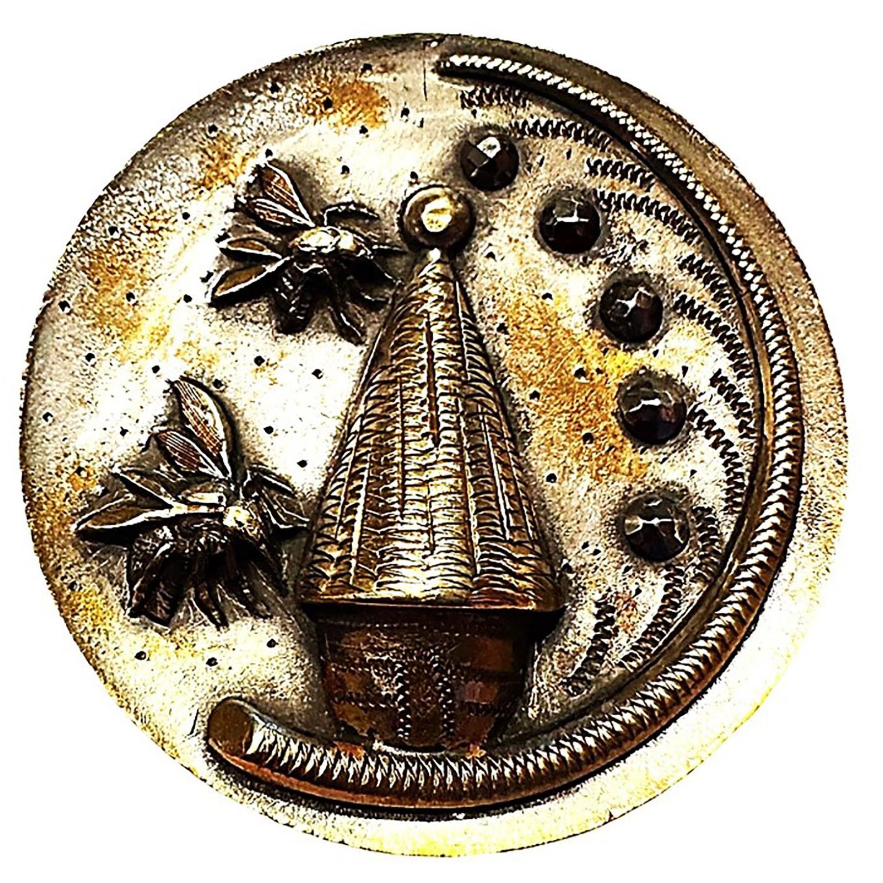 1 Large 19th century beehive and bee pictorial button. This is a wonderful brass button from the Victorian era depicting a large detailed relief Beehive and two bees along with cut steel OME on the tole decorated brass setting.