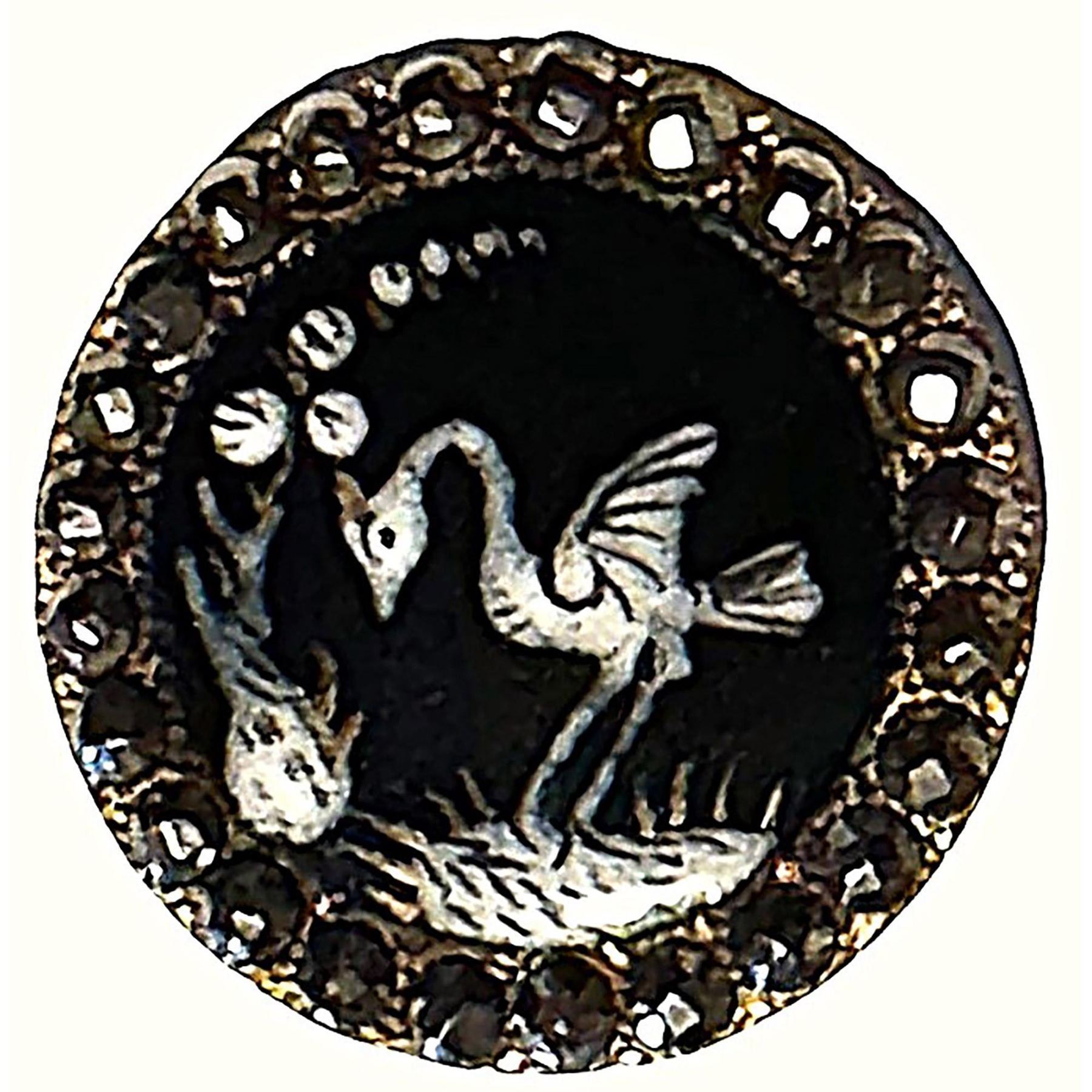 1 Medium 19th century Monochromatic example with a bird. These lovely monochrome enamels with cut steel borders have often been confused with the technique of En-Grisaille. To learn m ore about monochromatic enamels and En Grisaille work take time to purchase and look at Karen Cohen's new book strictly on enamel buttons and their techniques, its a very informative book.