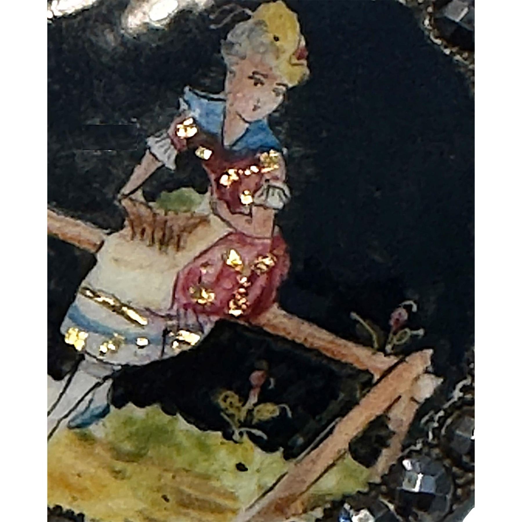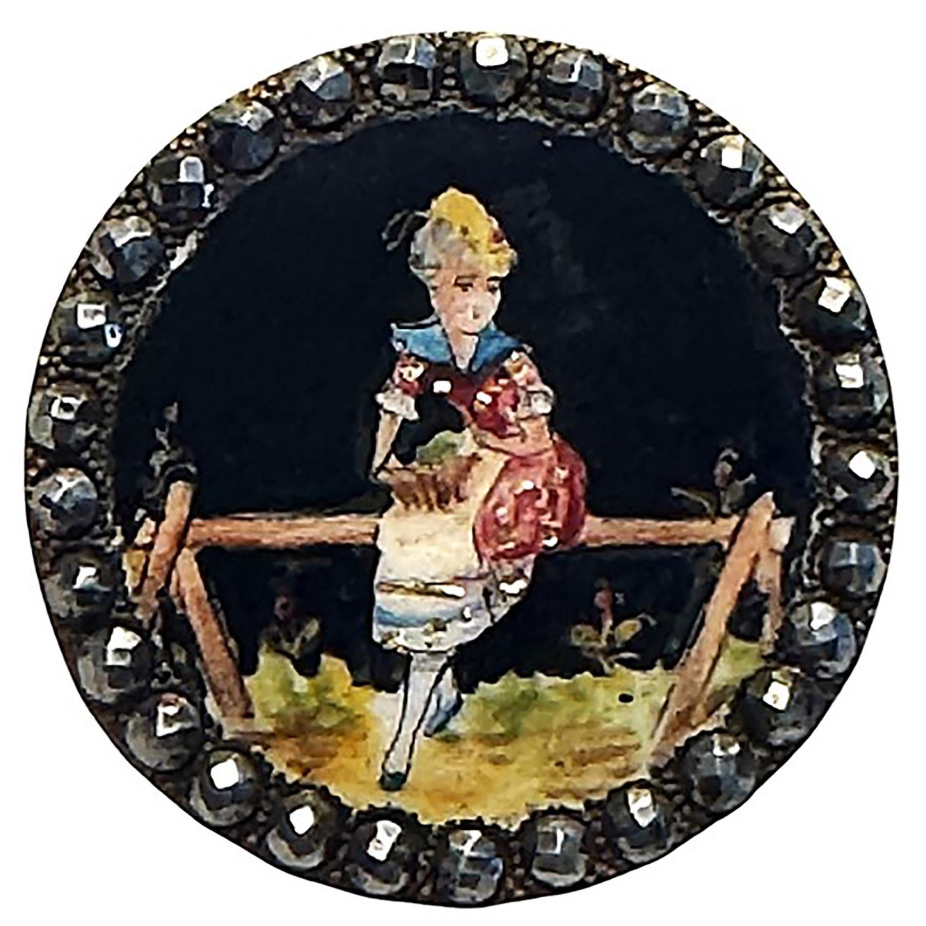1 Large 19th century polychrome enamel lady button. Here is beautifully executed and colorful enamel with gold paillons over a black background and framed in a cut steel border.