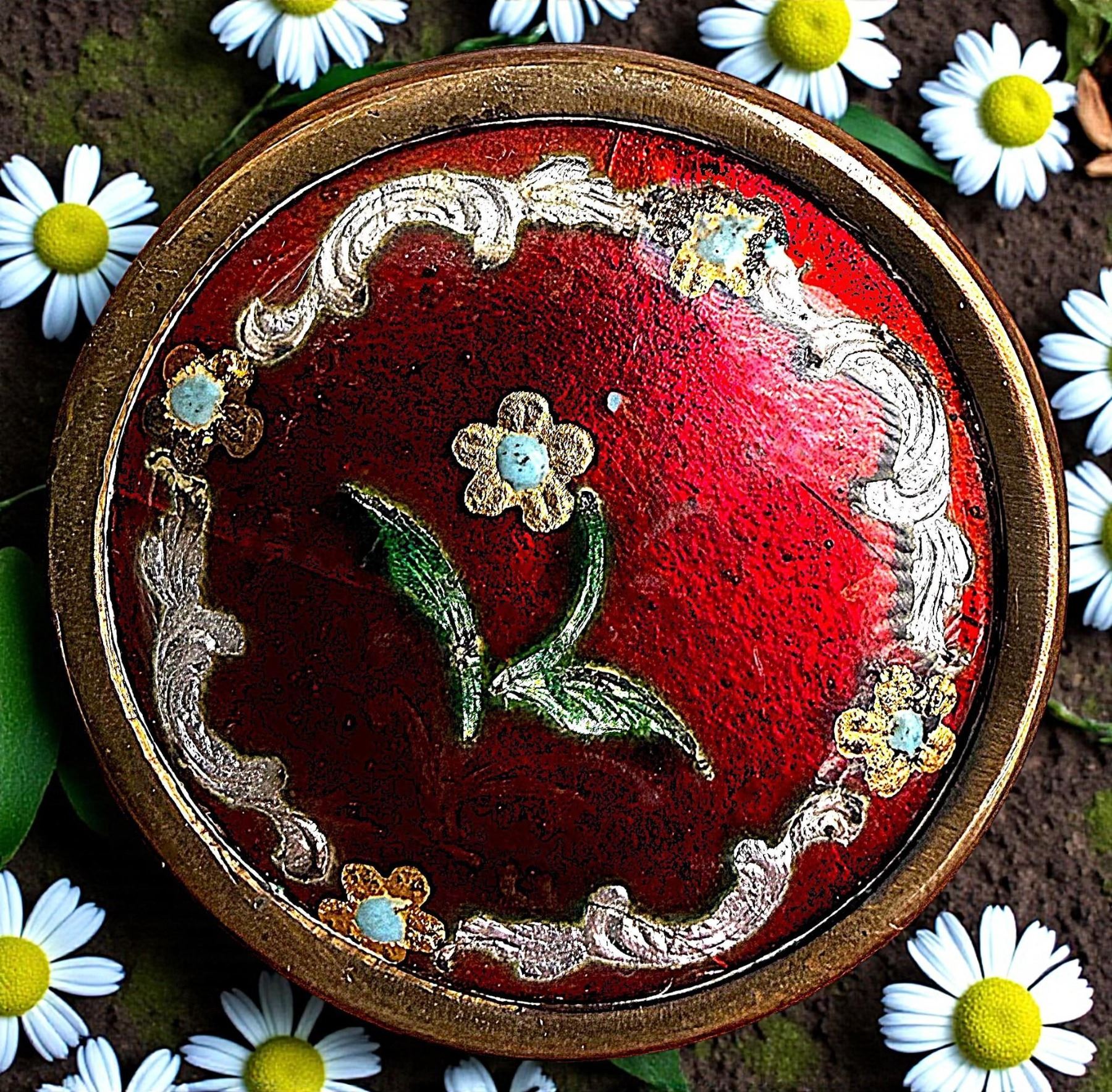 1 Medium size 19th century foil enamel red background example. As one who specializes in enamel buttons as many of you are aware of, Bruce tells us that red enamels are much more uncommon than one may realize. This gorgeous example boasts an array of colorful foils making up the floral and border design in this red basse taille background enamel in a brass setting. It is more stunning in person and hard to photograph.