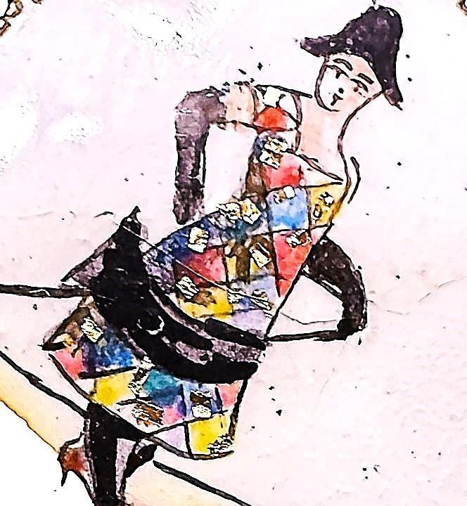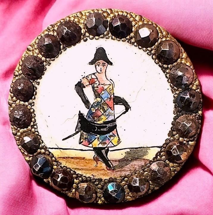1 Medium 19th century polychrome enamel with cut steel border. Here is a lovely colorful enamel figural with gold foil paillons in fine condition and framed with brilliant cut steels.